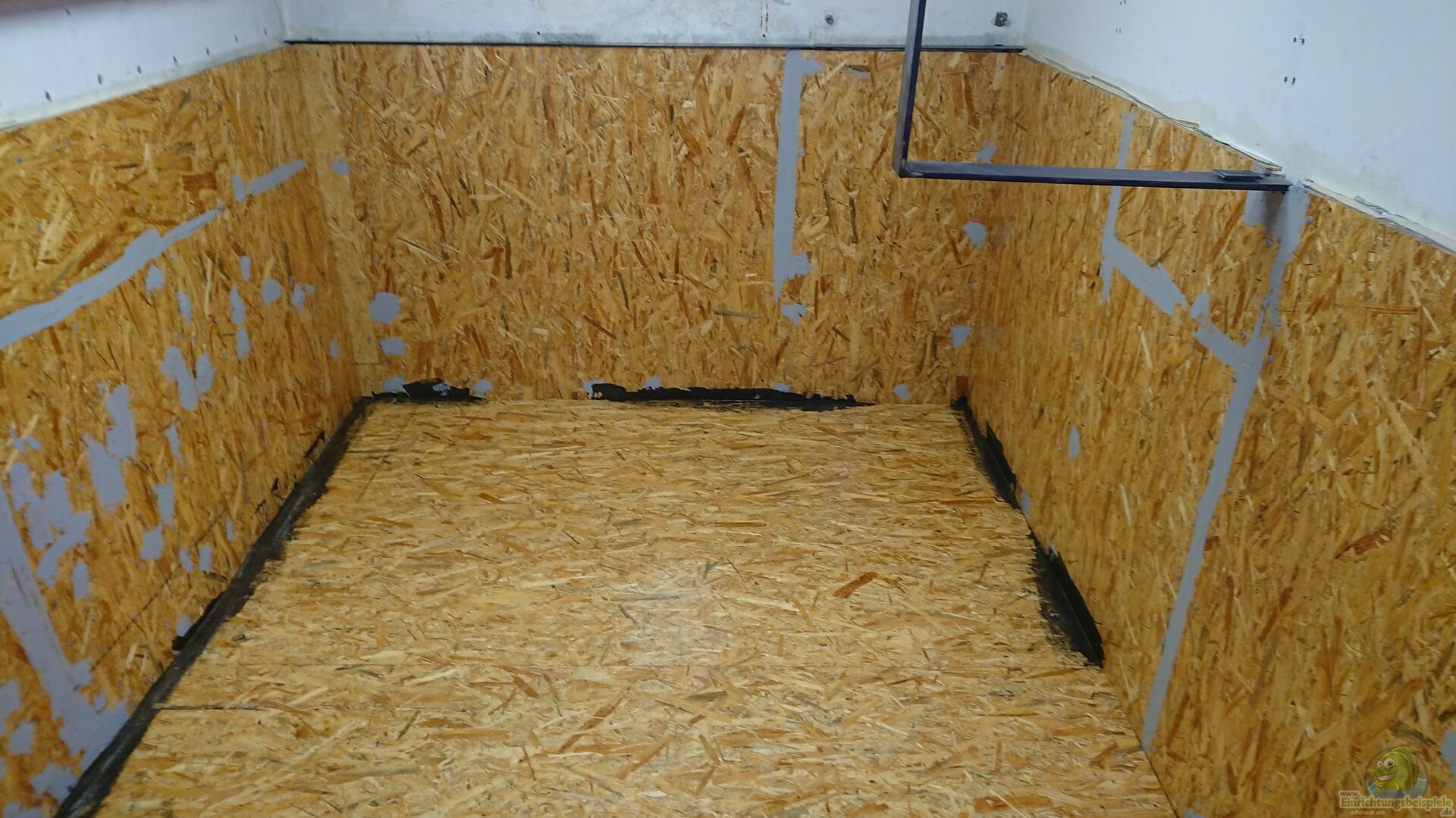 Das Becken besteht aus GFK und einer Frontscheibe. Ein Kellerraum ist durch die Frontscheibe abgetrennt worden und dahinter wurde dann mit Glasfasermatten und Epoxidharz das Becken gebaut. Die Filterung steht oberhalb des Beckens und besteht aus zwei 130cm Filterbecken.