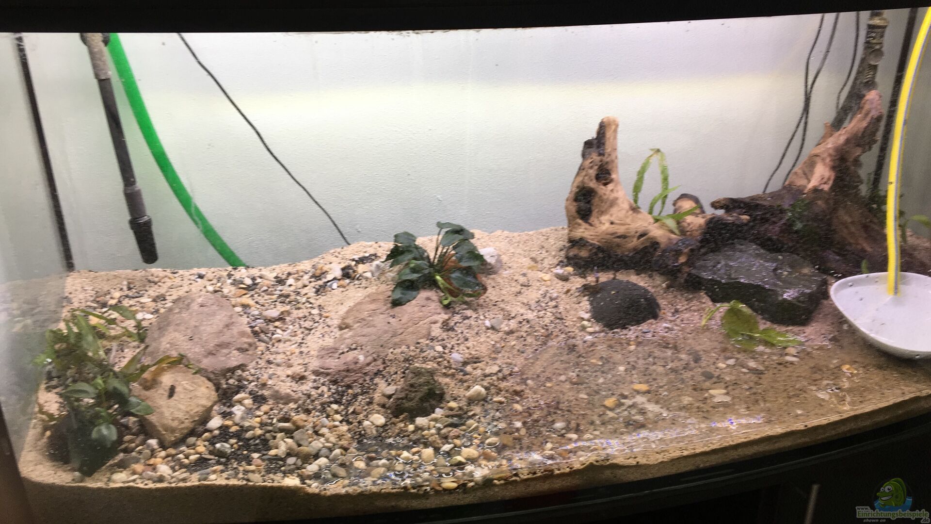 Zwei Wurzeln (bepflanzt mit Javafarn) Steine Kokosnusshöhle (bepflanzt mit Anubias) Blumentopfhöhle (ebenfalls mit Anubias bepflanzt) Buchenblätter