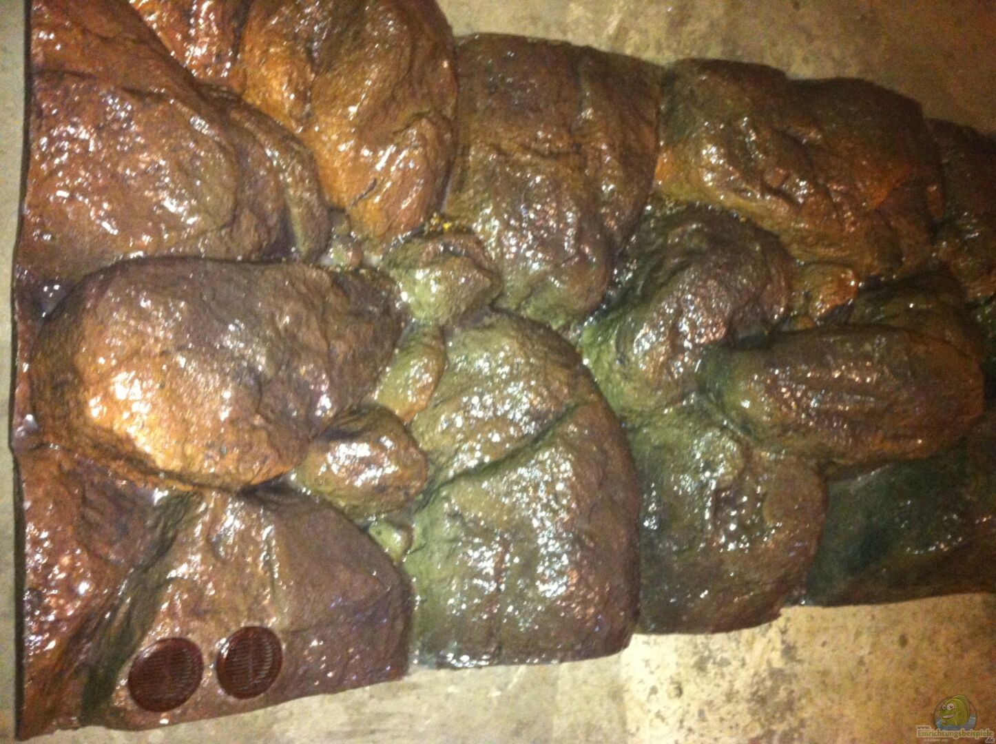 3 D Rückwand Felsen aus Schaum, abgedichtet mit Epoxidharz, verfeinert mit kleinen Steinchen an manchen Felsenspalten. Basaltgestein aus der Vulkaneifel, selbst gesammelt aus einem Steinbruch. Künstliche Steine auch aus dem Material der Rückwand bieten gerade dem Nachwuchs schöne Rückzugsmöglichkeiten weil sie innen hohl sind. Das lieben die Yellows und die mbamba bays und nutzen es auch zum balzen..