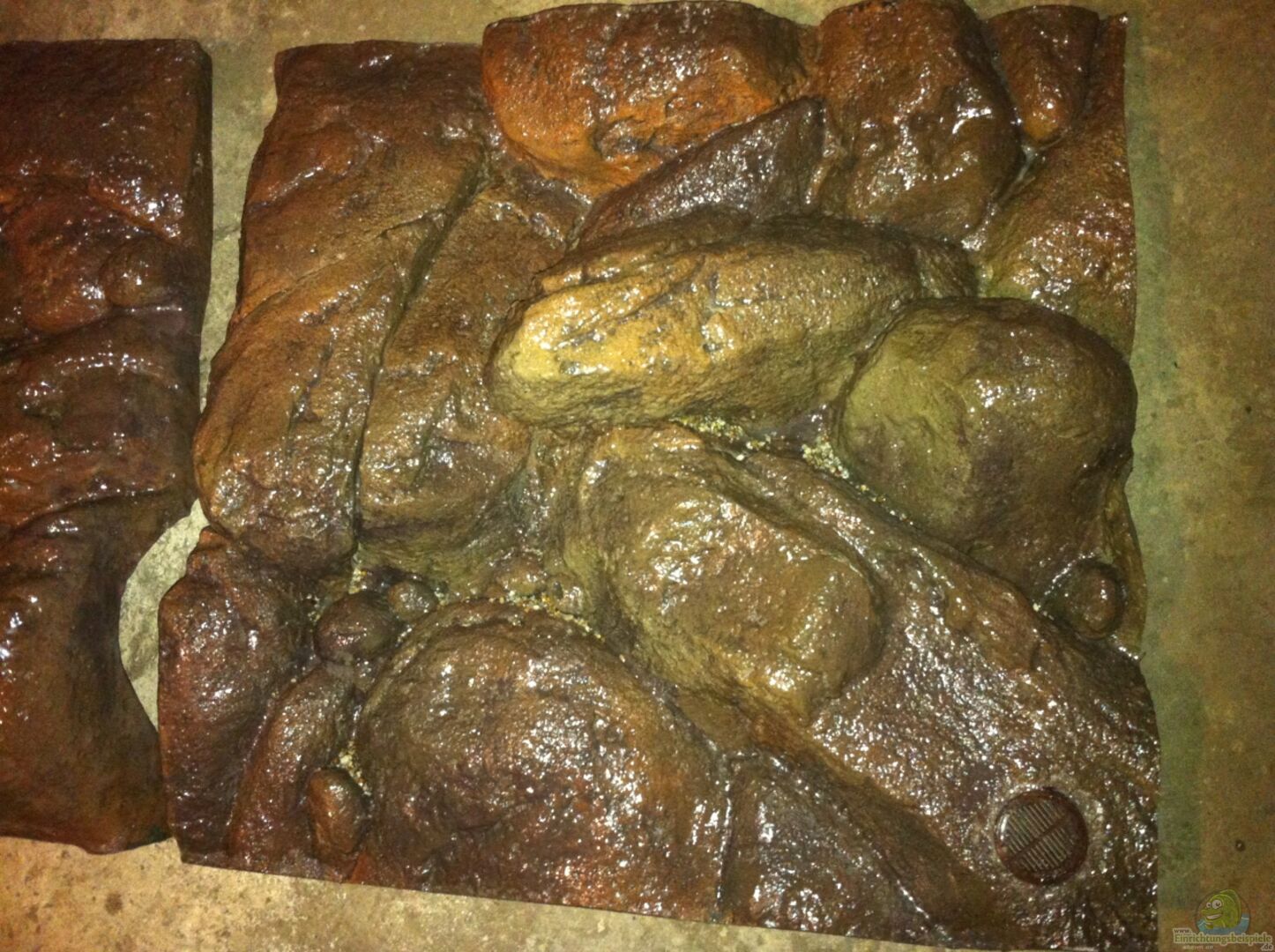 3 D Rückwand Felsen aus Schaum, abgedichtet mit Epoxidharz, verfeinert mit kleinen Steinchen an manchen Felsenspalten. Basaltgestein aus der Vulkaneifel, selbst gesammelt aus einem Steinbruch. Künstliche Steine auch aus dem Material der Rückwand bieten gerade dem Nachwuchs schöne Rückzugsmöglichkeiten weil sie innen hohl sind. Das lieben die Yellows und die mbamba bays und nutzen es auch zum balzen..