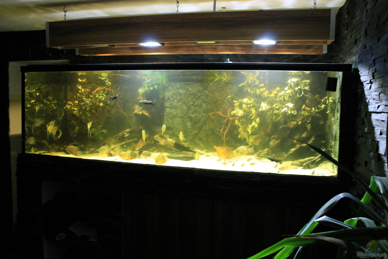 Das Becken ist eine Sonderanfertigung aus 15mm starken Floatglas mit Wasserstandsblenden aus Schwarzglas. Mittig an der Rückwand wurde ein Doppelwändiger Filterschacht mit bodennaher Ansaugung und ??erlauf eingeklebt. Im Schacht befinden sich zwei 55mm Lochbohrungen. 1x für den Filtereinlauf und 1x als Notüberlauf. Eine dreiteilige Glasabdeckung mit kleinen Futteröffnungen verhindert eine grö??ere Wasserverdunstung. Der Aquariumunterschrank wurde aus Ziegelsteinen selbst gemauert und durch [...]