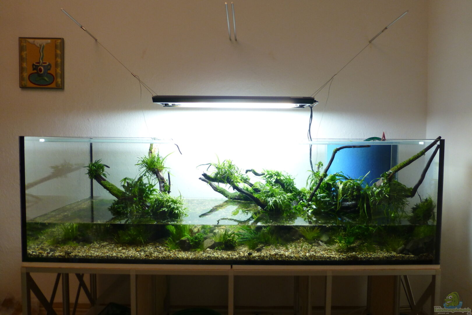 Das Becken ist eine Sonderanfertigung aus 12mm starken Floatglas, diamantgeschliffen und auf Sto?? verklebt. Leer wiegt es 145kg und es dauerte 20min bis es im 3.OG auf dem Schrank stand. Im rechten Bereich wurden jeweils zwei schmale Glasstreifen (Dicke 5mm) zur Aufnahme der Filtermatte des HMF eingeklebt. Zur Stützung der Matte gegen den Kies wurden auf der Bodenplatte senkrecht drei 8cm hohe Gleisstreifen gleicher Dicke geklebt. Zwischen diesen senkrechten ???Platten??? sind Spalte, sodass [...]