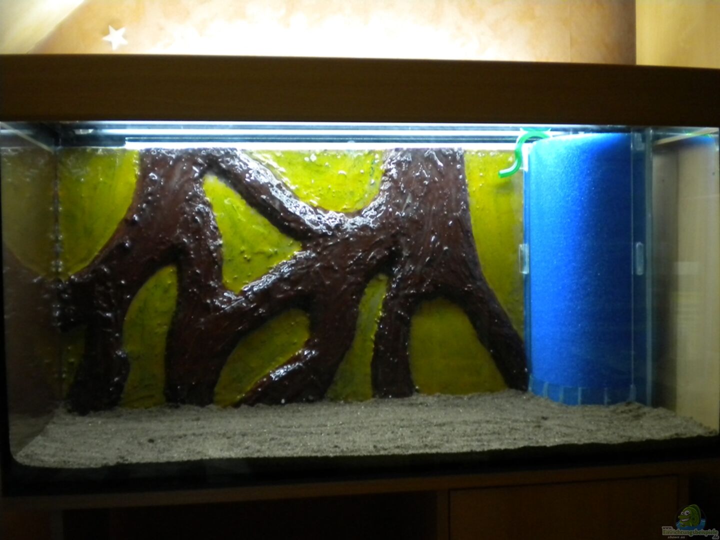 -Selbstgebaute Ruckwand: Als erstes habe ich alles aus Styropor ausgeschnitten und dann mit Gips verkleistert. Danach hab ich sie mit normaler Wandfarbe angemalt und mit 4 Lagen Epoxidharz versiegelt. Zum Schluss wurde sie mit Aquariensilikon eingeklebt. -Hamburger Mattenfilter Als erstes habe ich die beiden langen Glasstreifen eingeklebt und zum Schluss noch unten auf dem Boden fünf kleine Stückchen eingeklebt, damit kein Sand in den Filter läuft wenn man die Matte rausnimmt.