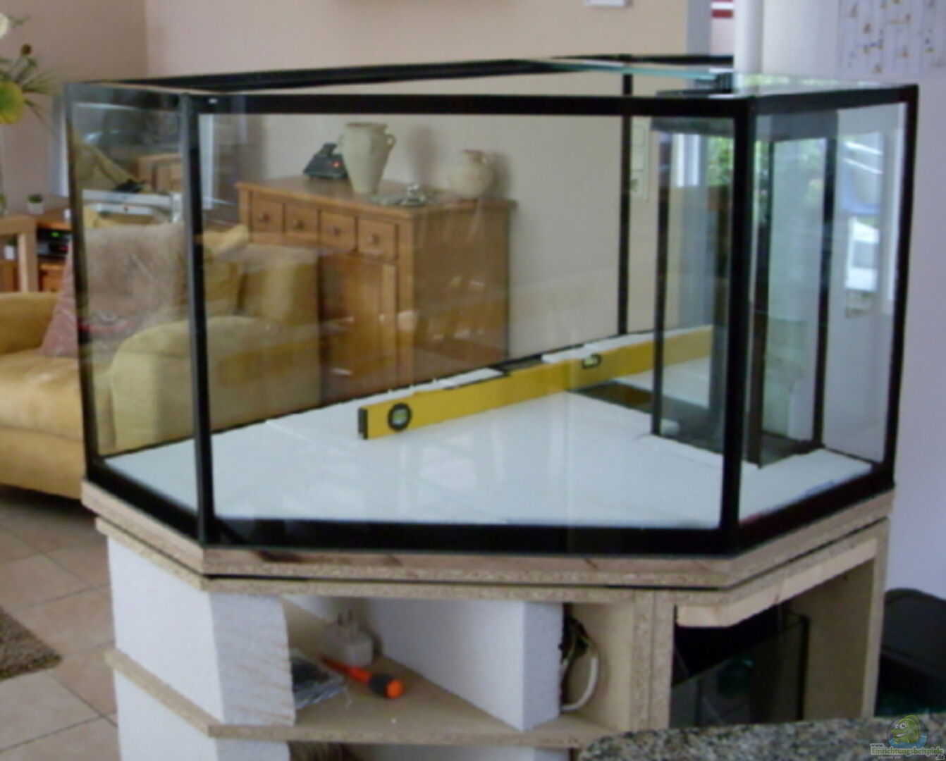 ein etwas anderes Aquarium ( Form ) Sonderanfertigung vom Aquarienbauer in der Nähe . Die Scheiben sind aus 12mm Floatglas und Wulstverklebt ( Nähte innen mit Glasstreifen abgedeckt ). Der Unterschrank ist ein Eigenbau aus Spanplatten und Ytong-Steinen , verkleidet mit Gipsplatten (grün) , nach dem verspachteln mit Streichputz gestrichen und zum Teil mit Antik-Bruchsteinen verkleidet. Die Beckenform hat sich nach langem planen so ergeben und hat sich gut in die Wohnung eingefügt . ===================================================== [...]