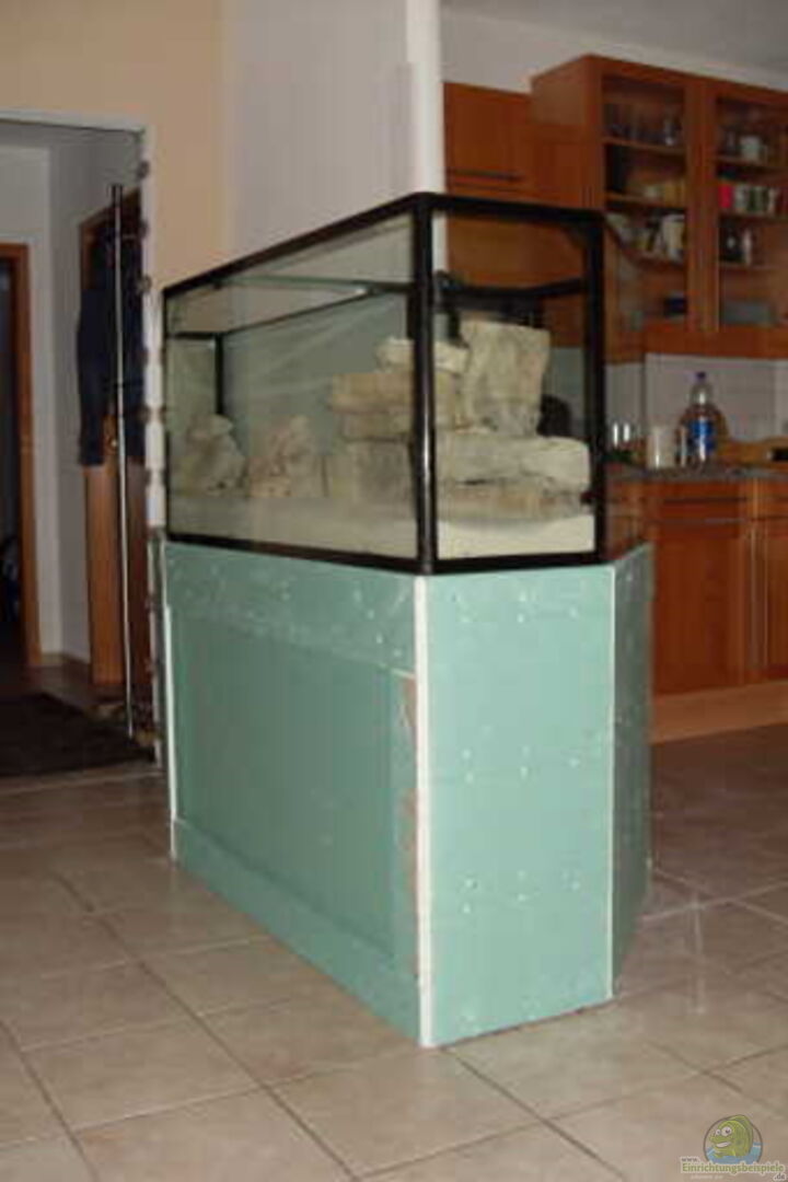 ein etwas anderes Aquarium ( Form ) Sonderanfertigung vom Aquarienbauer in der Nähe . Die Scheiben sind aus 12mm Floatglas und Wulstverklebt ( Nähte innen mit Glasstreifen abgedeckt ). Der Unterschrank ist ein Eigenbau aus Spanplatten und Ytong-Steinen , verkleidet mit Gipsplatten (grün) , nach dem verspachteln mit Streichputz gestrichen und zum Teil mit Antik-Bruchsteinen verkleidet. Die Beckenform hat sich nach langem planen so ergeben und hat sich gut in die Wohnung eingefügt . ===================================================== [...]