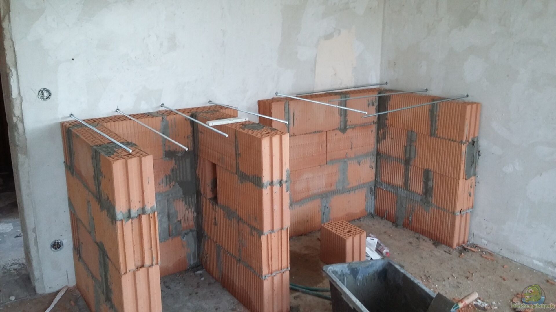 Das Becken ist eine Sonderanfertigung aus 15mm starken Floatglas mit Wasserstandsblenden aus Schwarzglas. Mittig an der Rückwand wurde ein Doppelwändiger Filterschacht mit bodennaher Ansaugung und ??erlauf eingeklebt. Im Schacht befinden sich zwei 55mm Lochbohrungen. 1x für den Filtereinlauf und 1x als Notüberlauf. Eine dreiteilige Glasabdeckung mit kleinen Futteröffnungen verhindert eine grö??ere Wasserverdunstung. Der Aquariumunterschrank wurde aus Ziegelsteinen selbst gemauert und durch [...]