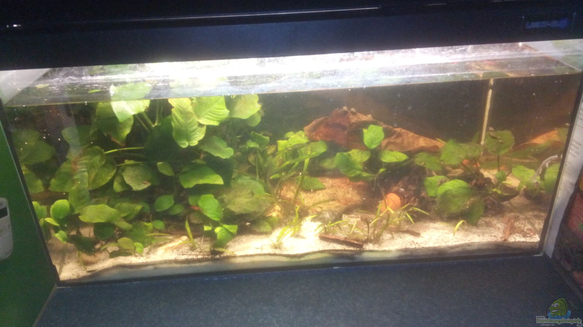 Das Becken fasst zwar 54l, es ist aber nicht ganz bis oben hin gefüllt. Optisch ist das sicherlich nicht sonderlich ansprechend. Aber ich habe mich dennoch dazu entschieden, da mir die Pflanzen, die oben aus dem Wasser ragen, ansonsten verbrennen. Au??erdem konnte ich beobachten, da?? die Zwergkrallenfrösche sich bei abgesenktem Wasserstand fast täglich an der Wasseroberfläche sonnen und dazu teilweise sogar auf die herausragenden Pflanzen kriechen.