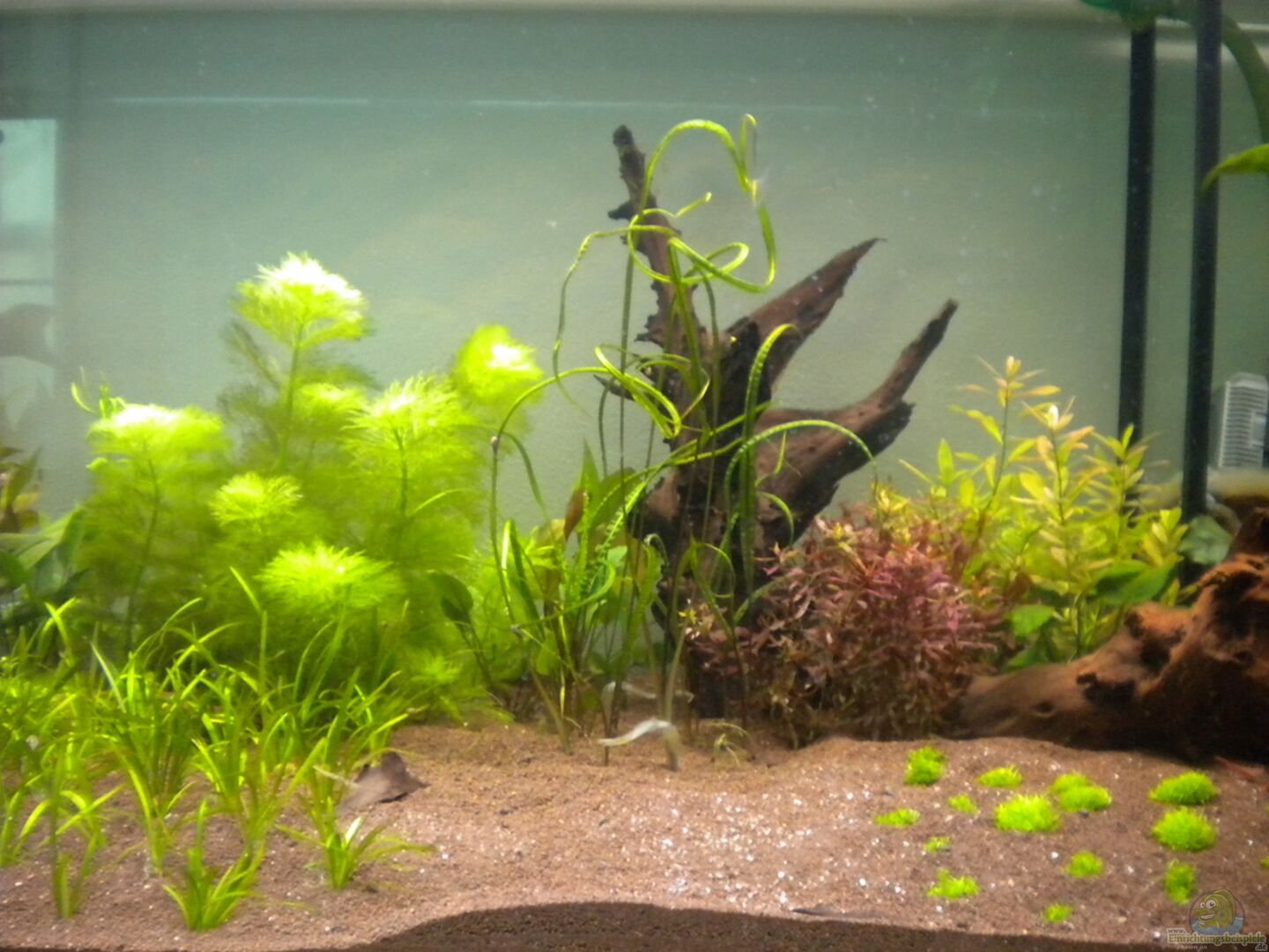 Echinodorus Bleherie (rechts vorm Filter) Echinodorus Regine Hildebrandt (mittig neben der Wurzel) Anubias nana und baterie (rechts hinter der Wurzel und vor den Bleherie´s) Nymphaea Lotus (rot) (rechts, vor Wurzel) Echinodorus Tenellus (mittig) Hygrophila Polysperma (nicht ganz rechts hinten/vor der Pumpe) Hygrophila difformis (am hinteren linken Beckenrand) *Pogostemon helferi Bekam leider zu weinig Licht ab und wurde entfernt *LImnophilla aquatica wuchs gut, verkrautete [...]