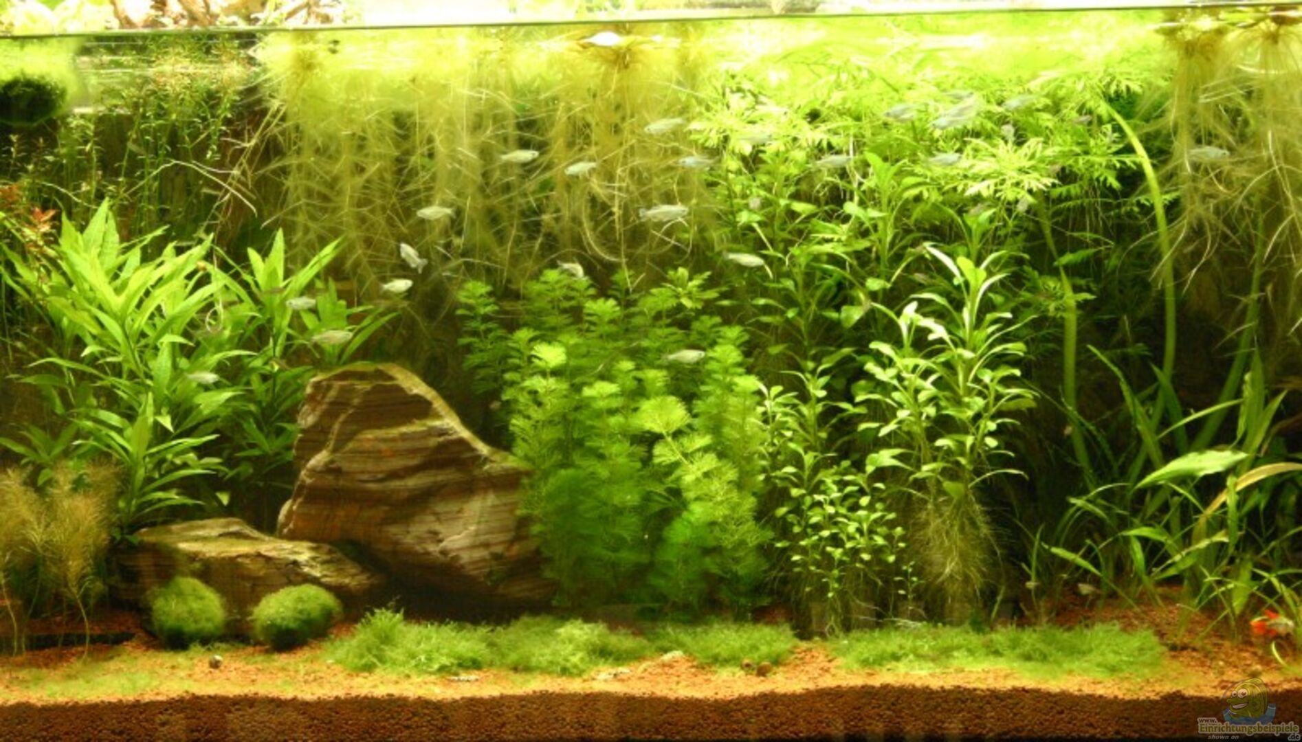 links vorne: rechts vorne: links mitte: Algenbälle vor dem Stein mitte links: mitte rechts: mitte hinten: Rückwand und Seiten Anubias nana und Anubia congensis links mitte-hinten: Vallisneria spiralis, Nuphar japonica, und eine mir unbekannte Fettblattart mit roten Stengeln und grünen Blättern links hinter Stein: Echinodorus "Red Rubin" und Hygrophila corymbosa mitte rechts: Crinum thaianum, umgeben von Cryptocoryne crispatula und C. wendtii sowie Echinodorus [...]