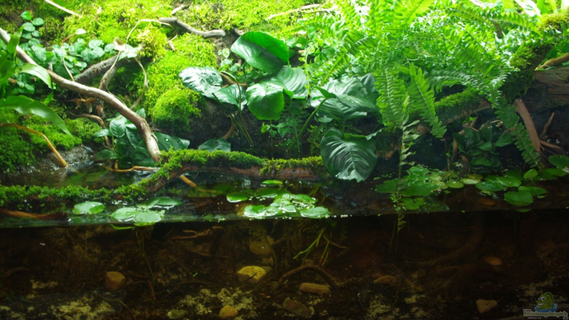 Das Becken ist ein Riparium und soll soweit es geht einen Uferabschnitt des afrikanischen Regenwaldes darstellen. Die Rückwand besteht aus Zement, Sand und Torf im Verhältniss 1:2:4. Dieses Material wird auch im Terrarienbau verwendet. Vorteil ist eine grobe, porige Struktur die Feuchtigkeit speichert und somit das Bepflanzen einfacher macht, insbesondere sollen Moose besser anwachsen.