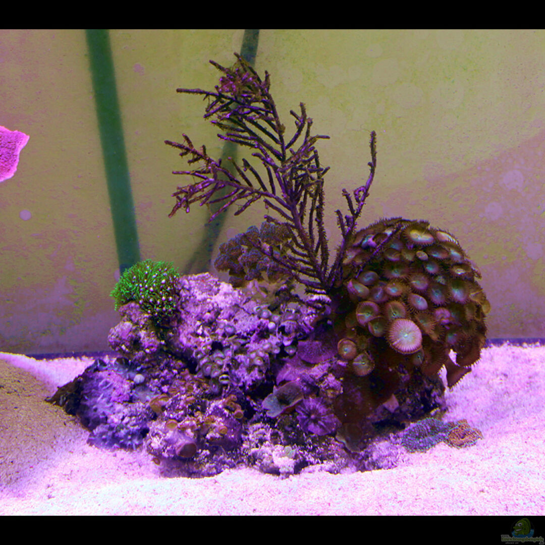 Das Becken hat zwei Riffsäulen und einen kleinen mittleren Steinaufbau, auf einen massiven Riffaufbau wurde bewusst verzichtet. Der Vorteil liegt in der deutlich besseren Umströmung der Korallen und den Abwechslungsreicheren Umfeld für die Tiere. Die Riffsäulen sind gebohrt und mit einem PVC-U Rohr gesichert.