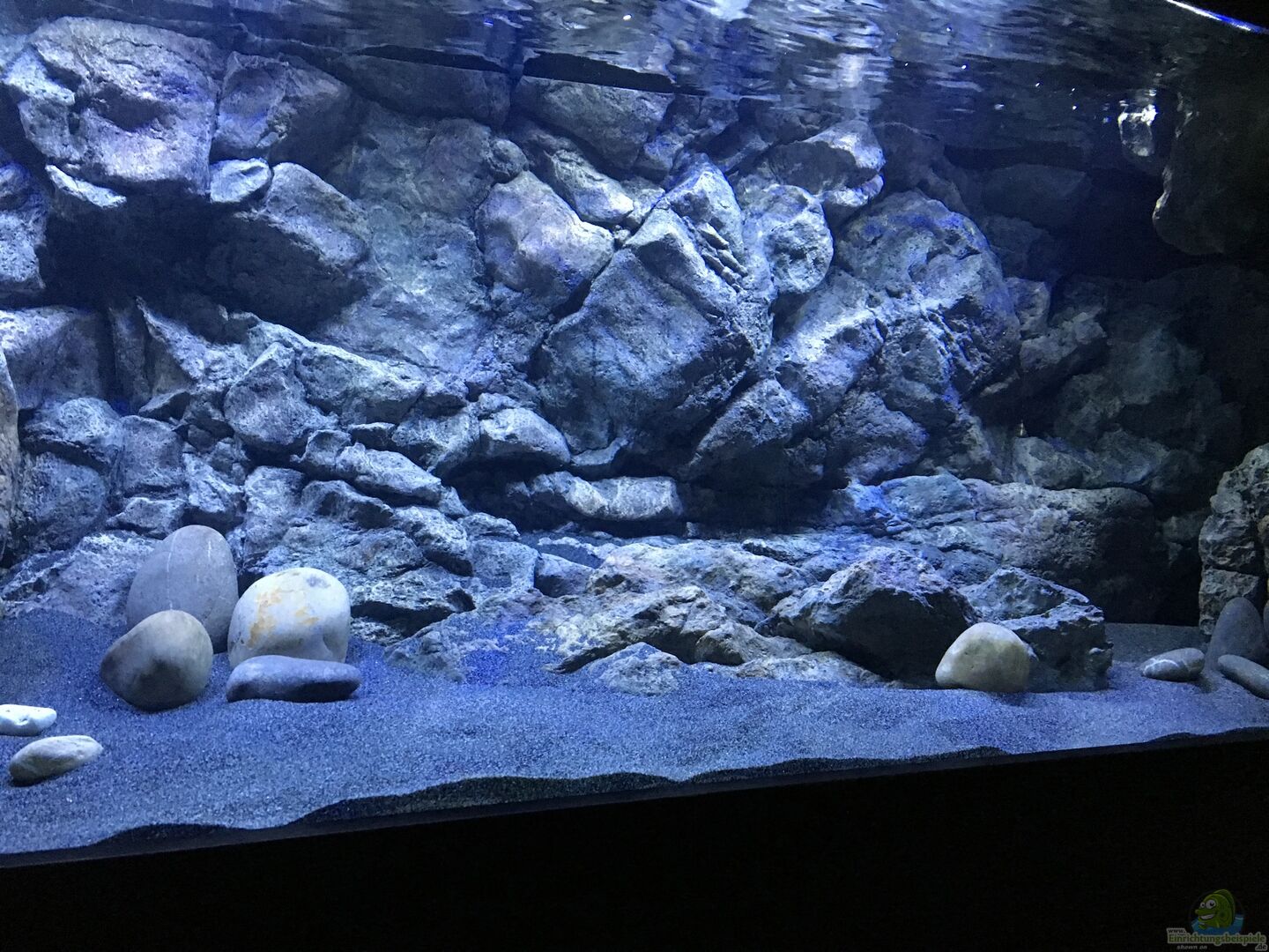 RockZolid Komodo Rückwand. 4 rockmodule auf Bodem und 2 Module links und rechts bestätigt an die Querstreben. Die Fische können hinten der Rückwand schwimmen, Auf beide Seiten vom Aquarium ist ein "Peephole" so wir schauen können was da hinten so alles passiert :-) Kies von Rhein (verschiedene Grösse und Farben)