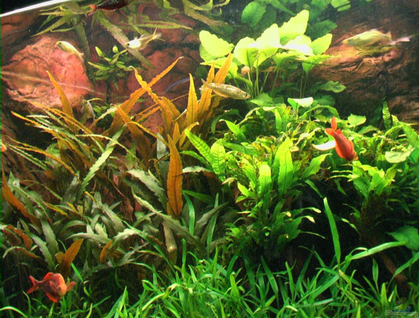 Eckaquarium mit leicht gewölbter Frontscheibe Eigenbau-Rückwand (Styropor, Aquarienzement, Airbrush, Epoxidharz)