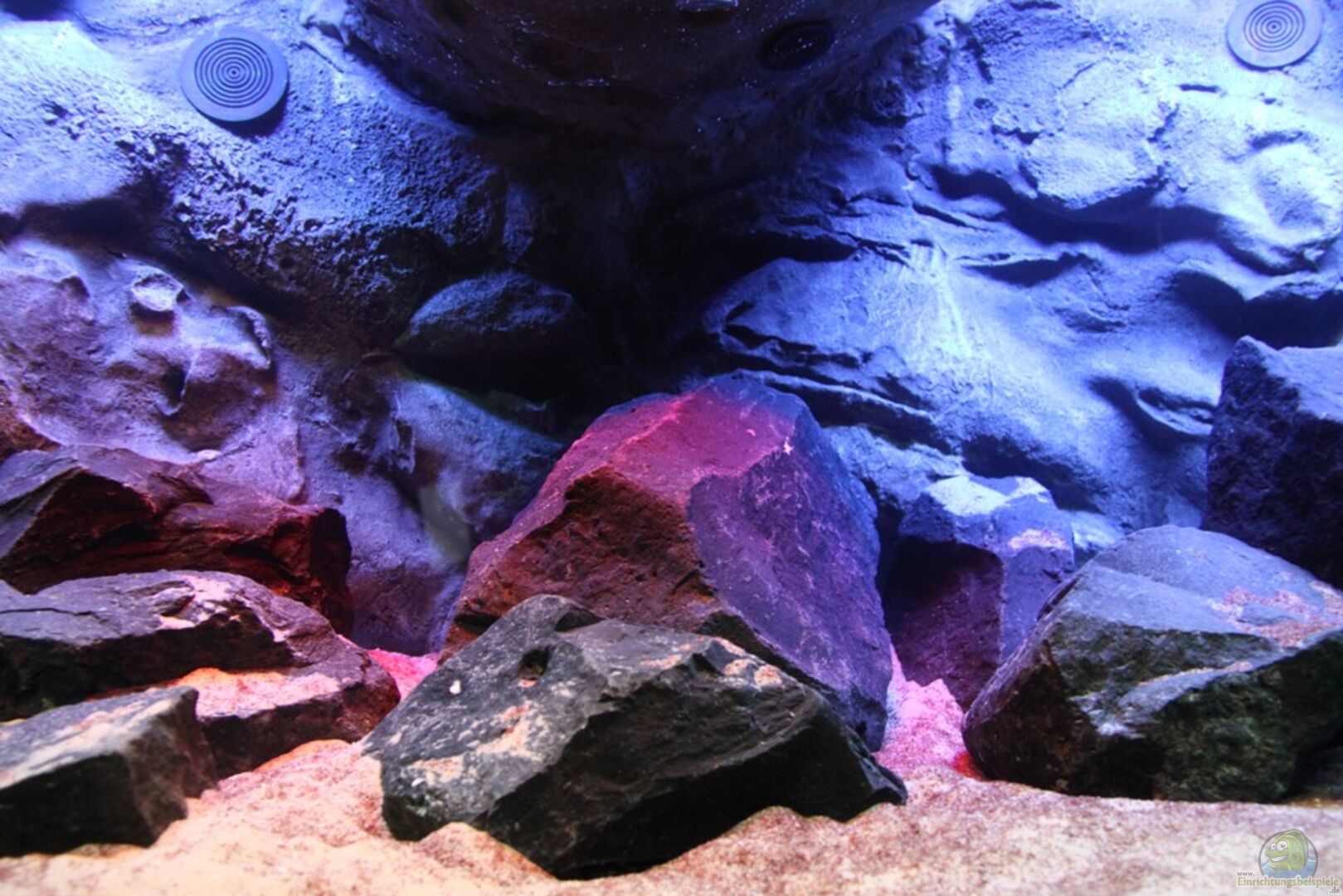 eingepasste 3-D Rückwand mit Felsüberhang und Versteck für die Strömungspumpe und Wasserwechsel. ca.120 kg Basaltgestein vom naheliegenden Steinwerk Die Basaltfindlinge wurden aus 3 Gründen ausgehöhlt 1.Gewichtreduzierung, da ich mit den grossen Brocken Aktzente setzen möchte 2.Es bleibt mehr Wasservolumen, da ca 30-40 kg Material weggefallen sind 3.zusätzliche Versteck und Rückzugsmöglichkeiten Diese werden natürlich so platziert, das die Höhlen nicht zu sehen [...]