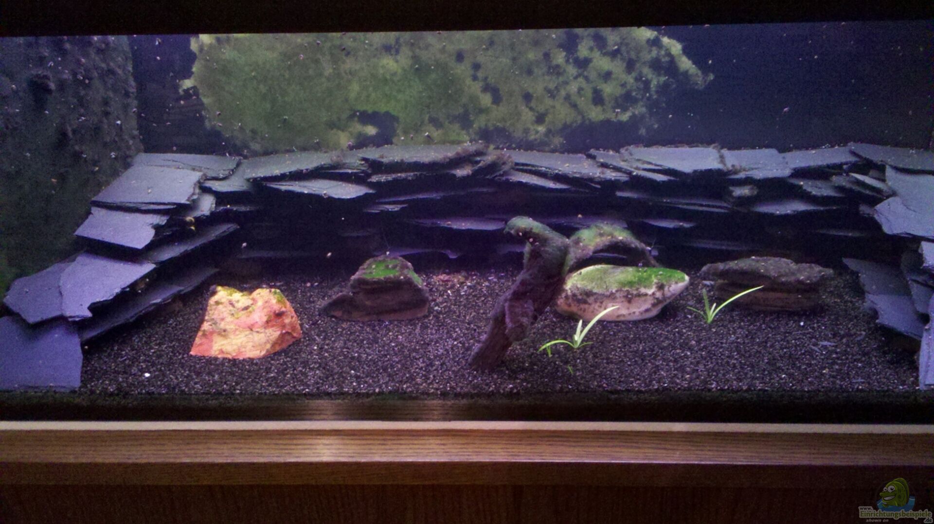 Es ist nicht leicht Bilder oder Videos aus der Maliliseen-Region oder dem Pososee zu kriegen wo die Tiere ursprünglich herkommen, ich habe versucht ein Abbild dieser Region zu schaffen. Deswegen auch keine Pflanzen. Ich hab das ganze Becken, natürlich bis auf die Frontscheibe, mit einer 10 mm Styroporplatte verkleidet, die hintere mit einer schwarzen Pappe beklebt.