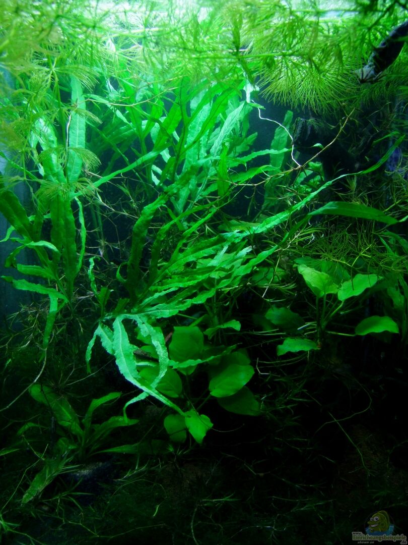 Boden: Moos (wenn ich noch wüsste, welches...) Sü??wassertang (Lomariopsis cf. lineata) Ein, zwei Mooskugeln, die ich noch übrig hatte Aufgebunden: Anubias barteri nana Javafarn Schwimmend: Nixkraut Hornkraut Wasserlinsen