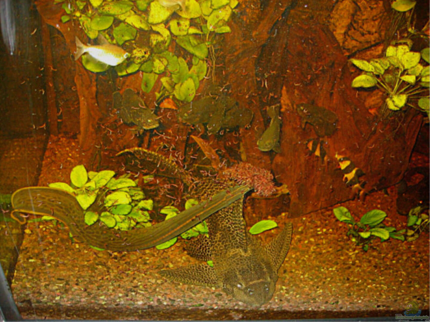 Wabenschilderwelse , 1x 30cm, 1x15cm, 1x4cm, 1x Red Bruno 15cm, 1 Panaque nigrolineatus, 1 Feueraal 50cm (Mu?? dazu sagen, da?? ich ihn nicht selbst gekauft habe sondern da?? er ein Geschenk war, hätt ihn bei der Grö??enprognose nie gekauft!! Fri??t ja auch wie jeck...)1 Strurisoma aureum, 4 Kongosalmler, 5 Astronotus, noch klein.2 Liniendornwelse, die ich leider nur nachts zu Gesicht bekomme...