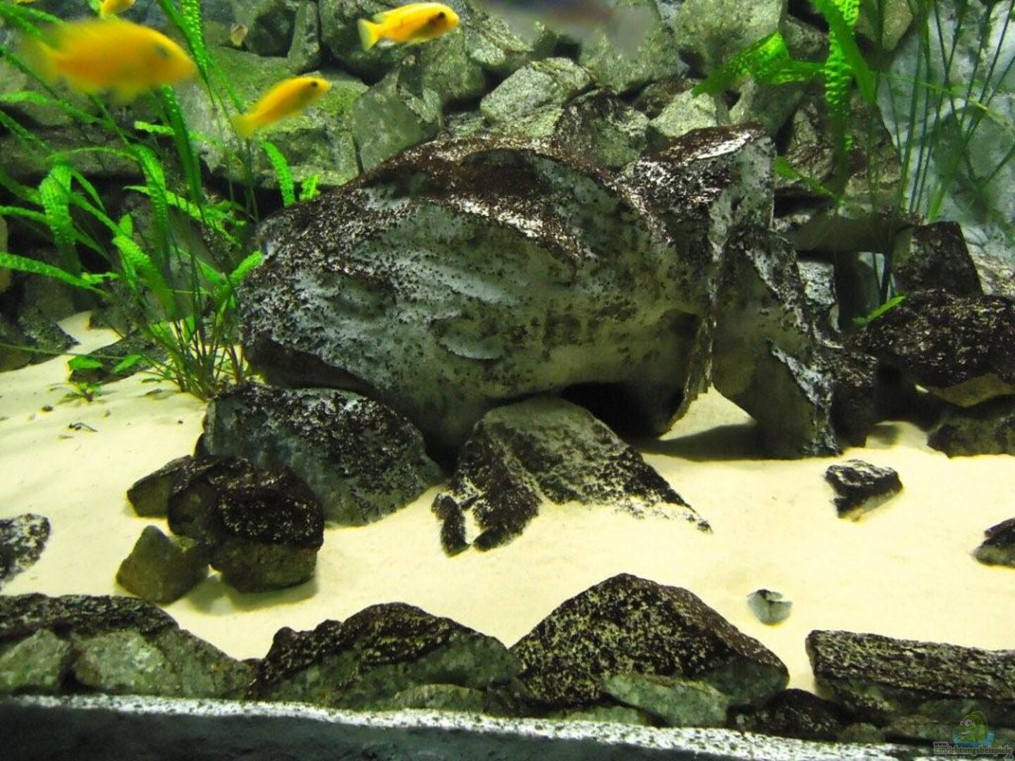Zum Thema Einrichtung ca. 1000 kg Granitbruch (zum Teil in der Rückwand verbaut und auch als Aufbauten und lose im Becken). Steinaufbauten teilweise bis zur Wasseroberfläche mit vielen Höhlen, ??berhängen und Verstecken. Zentral im Becken ein gro??er, modellierter Felsblock mit einer Höhle, wird an der Oberfläche aufgrund des Aufwuchses gerne abgeweidet. Darüber liegt ein 70cm gro??er, länglicher Granitfelsen. Linke Beckenseite ebenfalls gro??er, modellierter Felsblock als ??berhang. 9 [...]