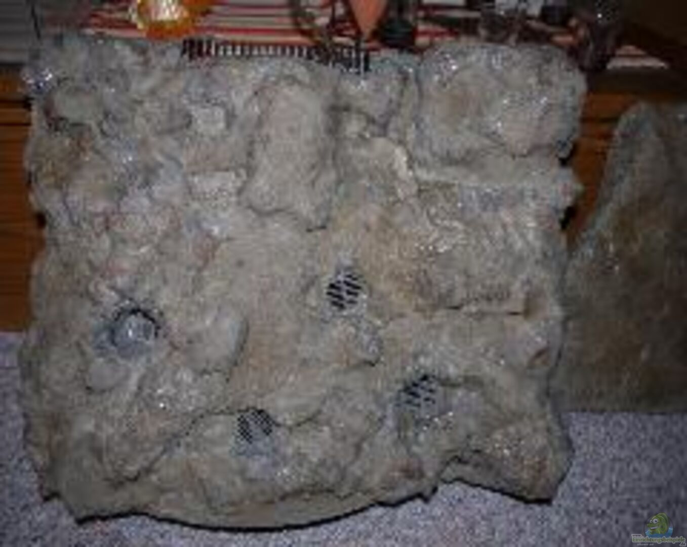 -------- Zur weiteren Einrichtung habe ich mich für Sandgestein endschieden, es befindet sich ca. 120Kg dieses Gesteins im Becken. Das Sandgestein ist über die gesamte Rückseite als Abruch aufgestapelt. Hierdurch entstanden viele Höhlen und Spalten in denen sich bedrängte Tiere sowie Mutter und Jungtiere verstecken können. Als Unterlage und Schutz für die Bodenscheibe dient eine Plexiglasscheibe die mit Silikon fixiert wurde.