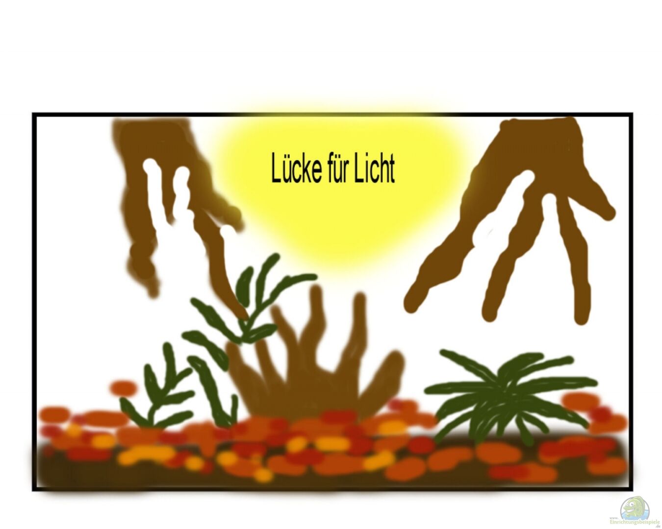 verschiedene Wurzeln bzw. ??ste und Hölzer teilweise gekauft, teilweise selbst gesammelt die Anordnung soll den Eindruck eines überfluteten Regenwaldboden erzeugen. Es werden also teils Baumwurzeln oder Baumstämme dargestellt! (einige werden auf dem Bodengrund plaziert, andere ragen von oben hinein.) desweiteren: Laub verschiedener heimischer Bäume, Seemandelbaumblätter, Erlenzäpfchen und halbierte Kokosnüsse als Bruthöhlen. Steine sind soweit nicht vorgesehen Vielleicht [...]