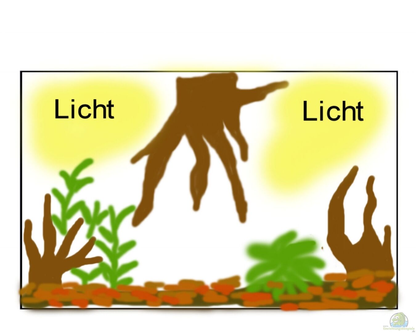 verschiedene Wurzeln bzw. ??ste und Hölzer teilweise gekauft, teilweise selbst gesammelt die Anordnung soll den Eindruck eines überfluteten Regenwaldboden erzeugen. Es werden also teils Baumwurzeln oder Baumstämme dargestellt! (einige werden auf dem Bodengrund plaziert, andere ragen von oben hinein.) desweiteren: Laub verschiedener heimischer Bäume, Seemandelbaumblätter, Erlenzäpfchen und halbierte Kokosnüsse als Bruthöhlen. Steine sind soweit nicht vorgesehen Vielleicht [...]