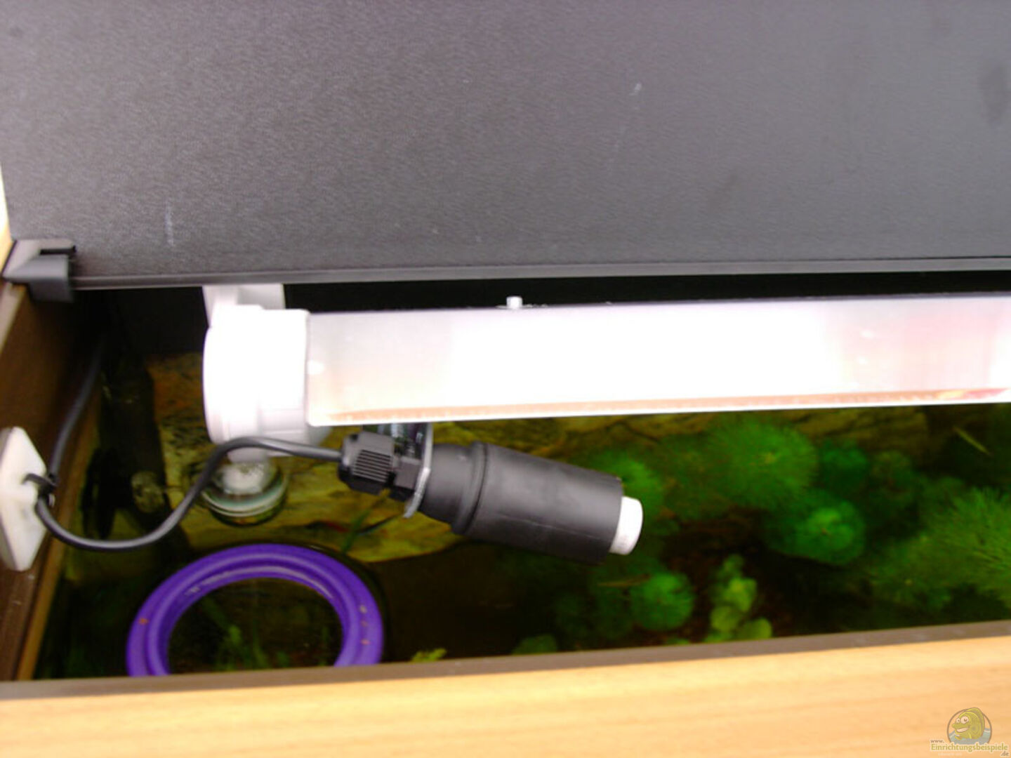 Strömungspumpe mit 800L/h hiter der Rückwand sorgt für ein wnig Strömung, Bio Co² Anlage Marke Eigenbau mit Lindenholzausströmer, 2 Lüfter die warme Luft vom Aquarium absaugen um die Kondensatbildung an der Abdeckung zu verhindern, Jäger Regelheizer 150W