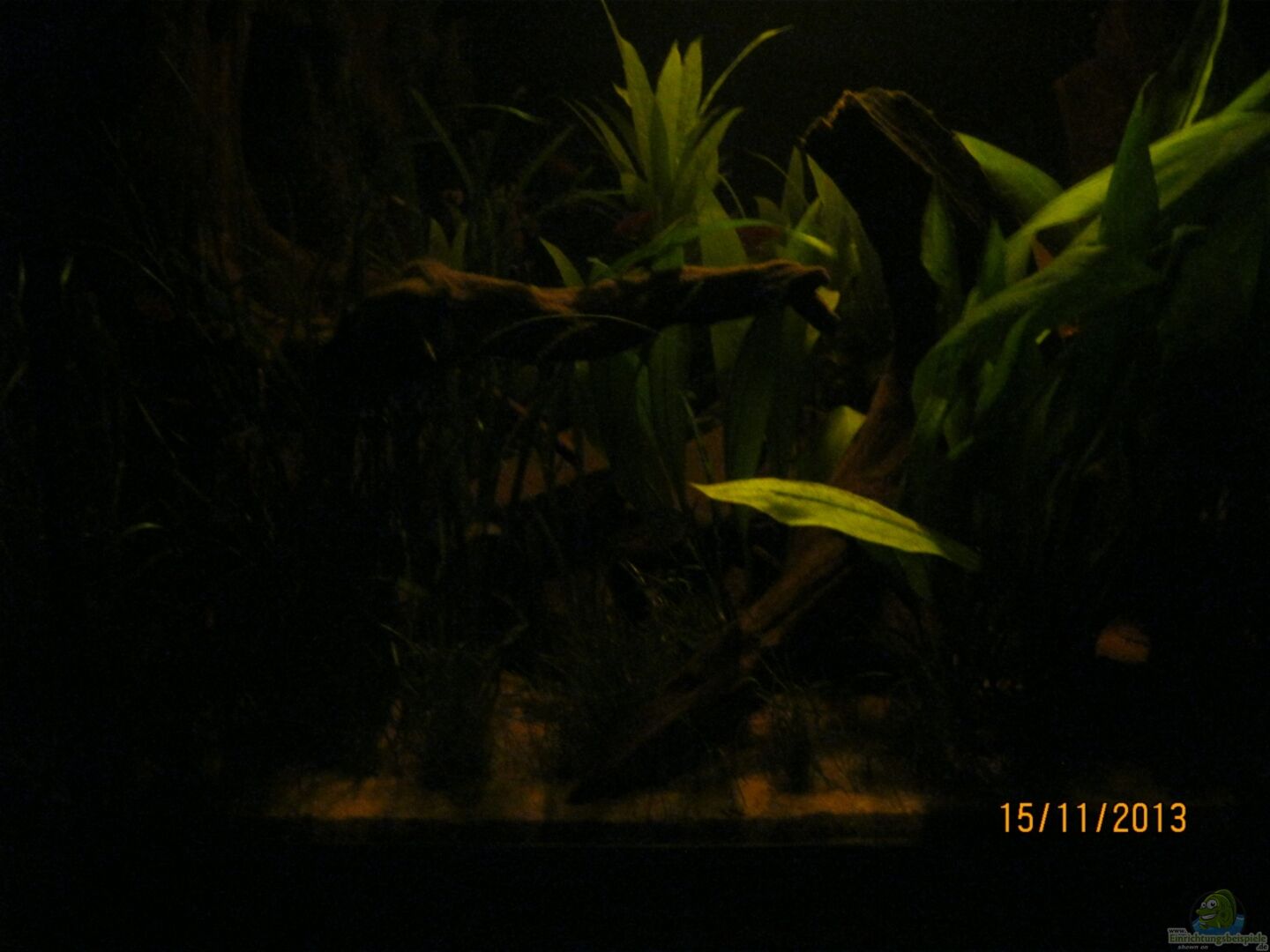 Das Aquarium ist aus 12mm Glas mit schwarzem Silikon verklebt. Bodenbohrungen sind nicht vorhanden. Das Becken steht auf einem 25 x 25 mm Stahlrohrgestell, unter dem Gestell eine 10mm Siebdruckplatte, auf der Unterseite mit Teppichboden beklebt um Unebenheiten in den Bodenfliesen auszugleichen. Auf dem Rohrgestell befindet sich eine 20 mm Spanplatte darauf eine Styroporplatte mit 10 mm Dicke. Die Rückwand und die linke Seitenscheibe sind mit einer schwarzen Folie beklebt und mit 10mm Styroporplatte [...]
