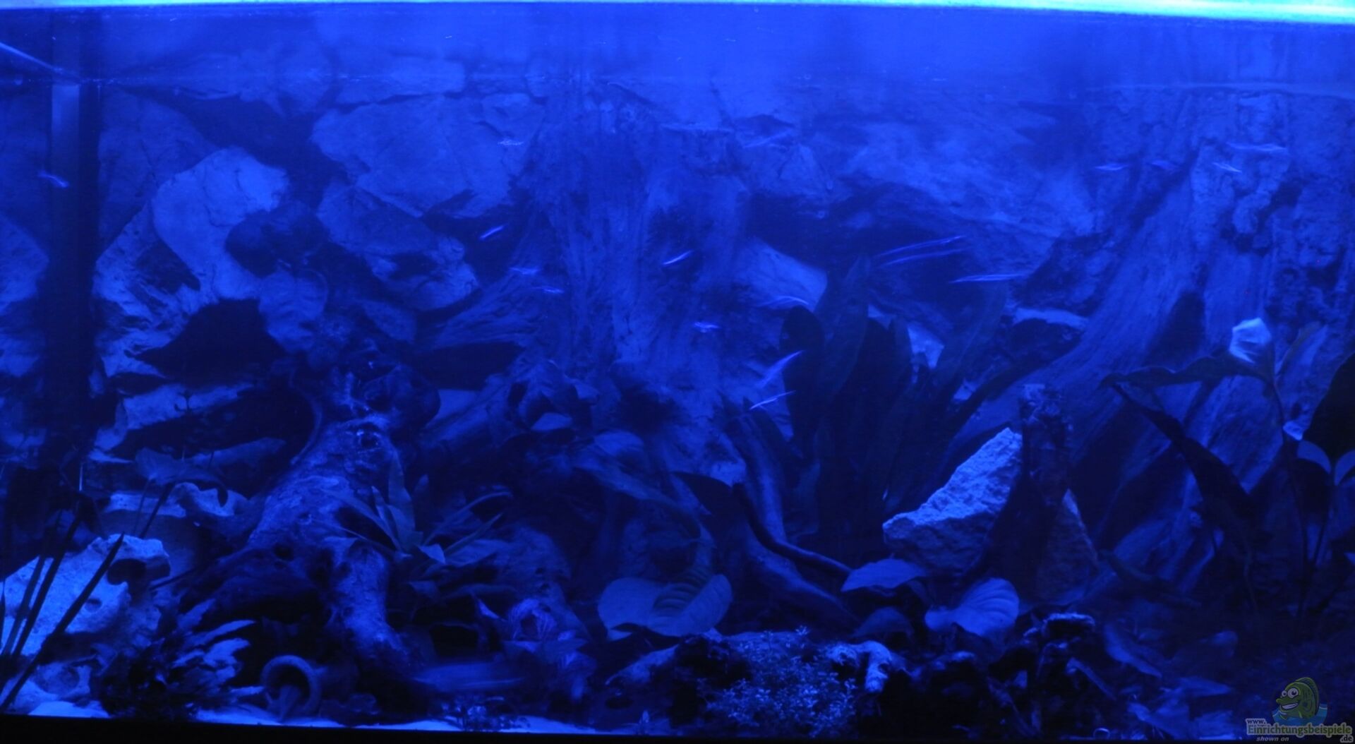 Das Becken hat eine handangefertigte Rückwand, die Felsen und Holz imitiert. Dahinter befindet sich der Heizstab und der Ansauger der Pumpe. Auch können die Fische die Rückwand hinterschwimmen und haben somit eine gute Rückzugmöglichkeit.