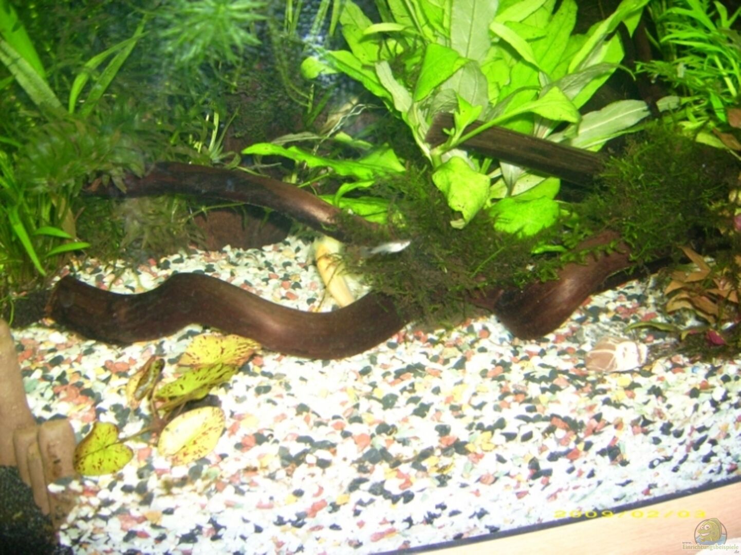 - 2 Moorkienwurzel - selbstgebastelter Garnelenstamm aus Ton - halbe Amphore mit Blumen bepflanzt - Selbstgebastelte Tonmauer für mein Welsbad(gebrannt bei 1100° - Lavasteine zu Teil mit Moos bepflanzt und als Ausströmstein - Moapinwurzel mit Moos bepflanzt - kleine Kieselsteine - eine Höhle - weitere Höhlen sind in der Rückwand eingebaut