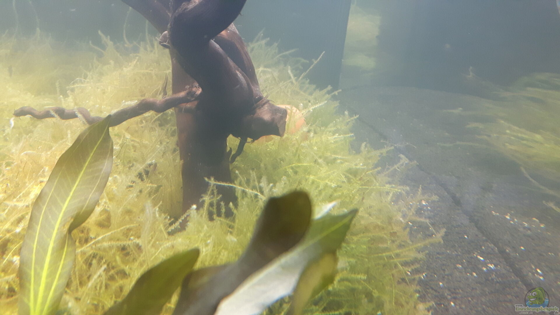 echte Moorkienwurzel, ca 20 - 30 cm, kleine Wurzel, ca 10 cm, ein Seemandelbaumblatt, einige Glasmurmeln zum Beschweren des Java-Mooses