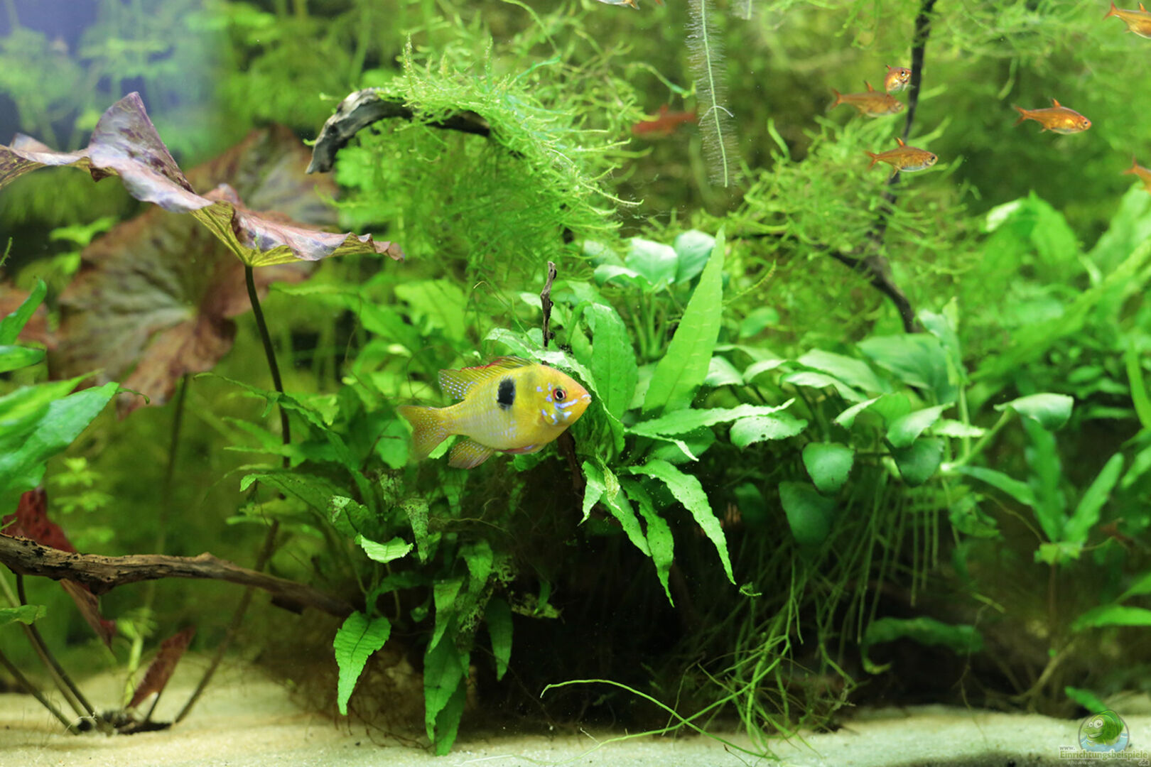 In der Beckenmitte wurden zwei Morkienwurzeln zusammengesetzt, auf denen Anubias, Microsorium pteropus und Javamoos aufgebunden sind. Die Wurzeln der Anubias und des Javafarns bilden sehr schöne Verstecke und Ruheplätze, besonders für die Panzerwelse. Zwei graue Schiefersteine (auf Styropor geklebt) bilden auf der linken Seite eine kleine Terrasse, auf der Anubias wächst. Links von dieser wachsen Cryptcorynen, auf der anderen Seite ist eine kleine freie Sandfläche. Rückwand: Schwarzes [...]