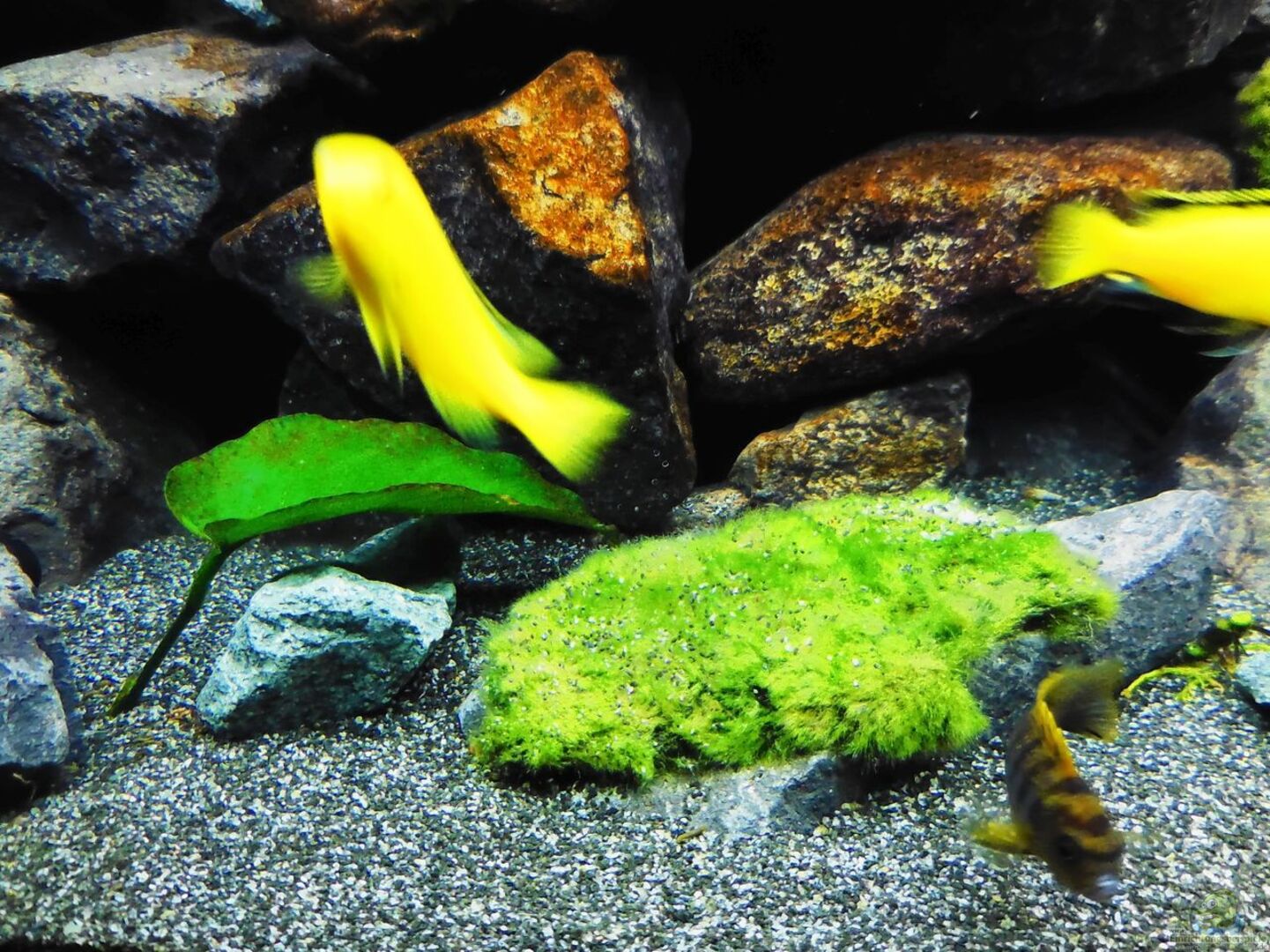 Da meine Fische leider bisher alle Versuche das Becken zu bepflanzen vereitelt haben, ich aber nicht gänzlichst auf ein bisschen grün verzichten möchte, befinden sich mittlerweile vier Kunstpflanzen im Becken. Au??erdem habe ich noch mehrere Steine mit Moosbällen beklebt, diese werden erstaunlicherweise nicht gefressen.