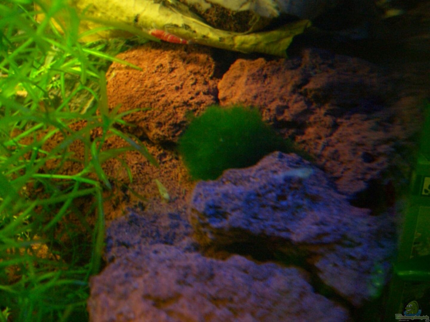 Anubias barteri auf Wurzel, Nixkraut, Echinodorus tenellus, Hemianthus callitrichoides, Mooskugel auseinandergerissen und in spalten der Lave gedückt, Echinodorus tropica , Wasserlinsen, Teichlebermoos