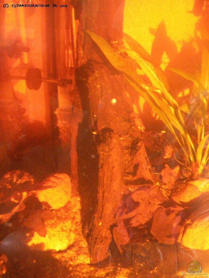 ___ - 3 Mangrovenwurzeln; ___ - einige Steine; ___ -- Falllaubschicht - bestand vorerst aus Eichenlaub (welches aber optisch nicht zu den lokalen Baumarten passte), - Wallnuss - & Kirschlaubblätter (ähneln dem südamerikanischen Blattwerk schon ein wenig mehr & werden demnächst "versuchsweise" zur Bestimmung der "Haltbarkeit" eingebracht; - Buchen- und Haselnuss wird auch in Erwägung gezogen); ___ - Holunderbuschäste [...]