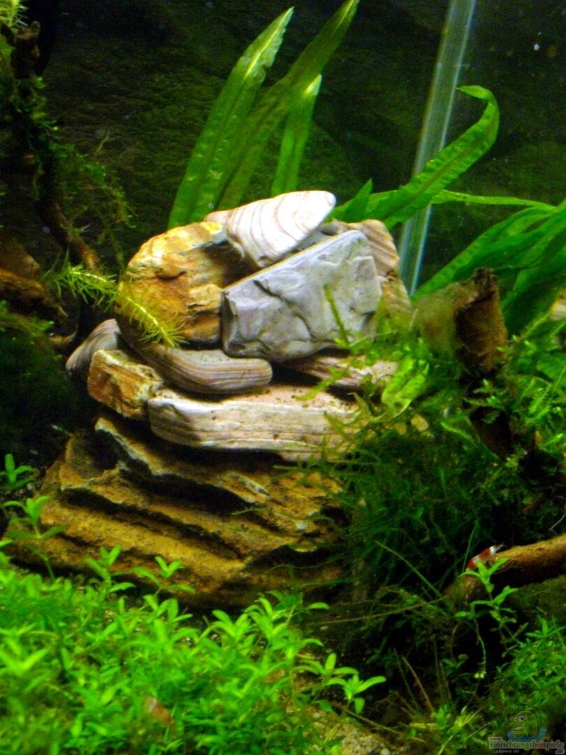 -ein besonders schönes Stückchen Korkenzieher-Walnuss-Ast dreigeteilt und mit Javamoos umwickelt (sollen kleine Bäumchen werden) -Steinaufbauten aus rosa-bräunlichen Pagodensteinen, so arrangiert, dass Höhlen entstehen --> gibt schöne Unterkünfte für die Krabbler -Erlenzapfen -Seemandelbaumblätter und -Rinde -Buchenblätter -Rückwandposter mit gräulichem Stein-Aufdruck -kleine Tonröhren hinterm Filter und hinter den Steinaufbauten versteckt