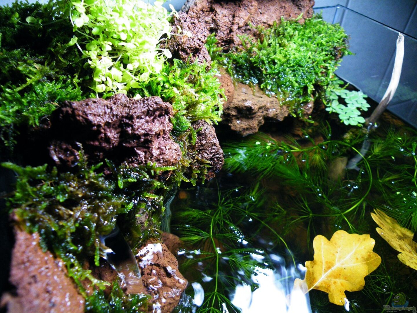 Eine kleine Oase im Badezimmer Für die Futter-Schneckenzucht meiner Erbsenkugelfische hatte ich bis dato (10.11.2010) ein 12L Becken im Bad stehen, welches auch der Aufzucht der Danio Choprae diente. Um den Anblick etwas zu verschönern, entschied ich mich für dieses etwas grö??ere AQ. Die beiden Wände sind aus mit transparentem Silikon verklebtem Lavagestein entstanden und der Auslauf des Eck-HMF wurde zweigeteilt, um den Eindruck eines kleinen Wasserfalls nachzuahmen. Die Technik [...]
