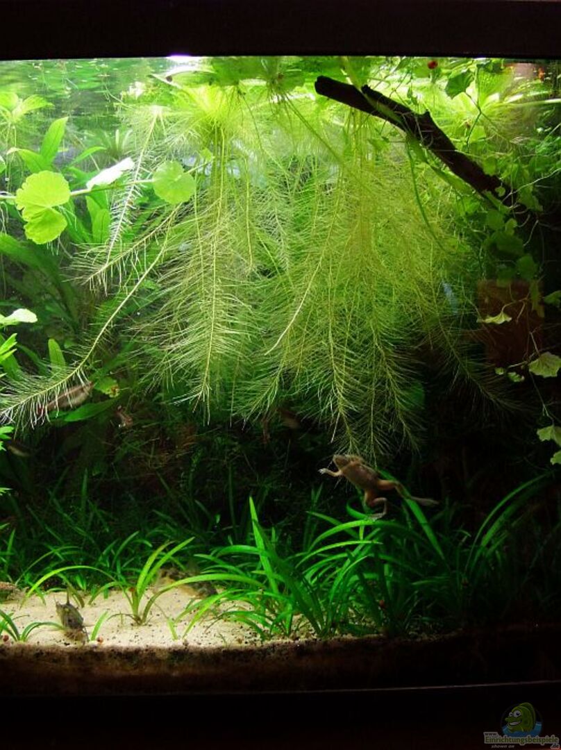 Hintergrund: Hygrophila siamensis Hydrocotyle leucocephala Vallisneria sp. Aufgebunden: Anubias barteri nana Lomariopsis cf. lineata (braucht bei mir viel Licht, wächst gut an Holz, das nah an die Wasseroberfläche reicht) Javamoos Vordergrund: Sagittaria subulata (sehr schattenverträglich, absolut empfehlenswert) Hygrophila polysperma Schwimmend: Cardamine lyrata Hornkraut Muschelblumen (werden durch Flüssigdüngung riesig) Wasserlinsen (lästig!) Düngung: [...]