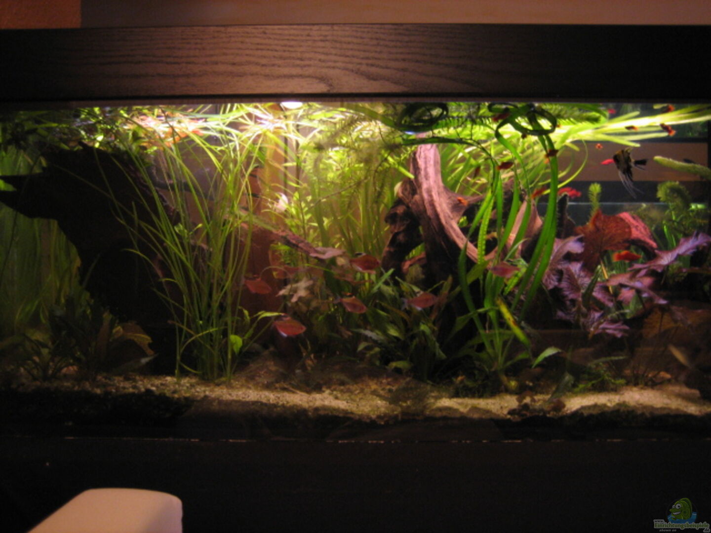 12 Kirschflecksalmler (Hyphessobrycon erythrostigma) ca. 15 Korallenplaty (Xiphophorus maculatus) 5 Zebraschmerlen (botia stritia) 2 Grüne Fransenlipper (Labeo frenatus) 2 Antennenwelse (Ancistrus dolichopterus) 1 Bratpfannenwels (Bunocephalus coracoideus) 1 Skalar und zwei drei Findlinge, welche die Langlebigkeit gegenüber ihrem damaligen Schwarm neu definieren