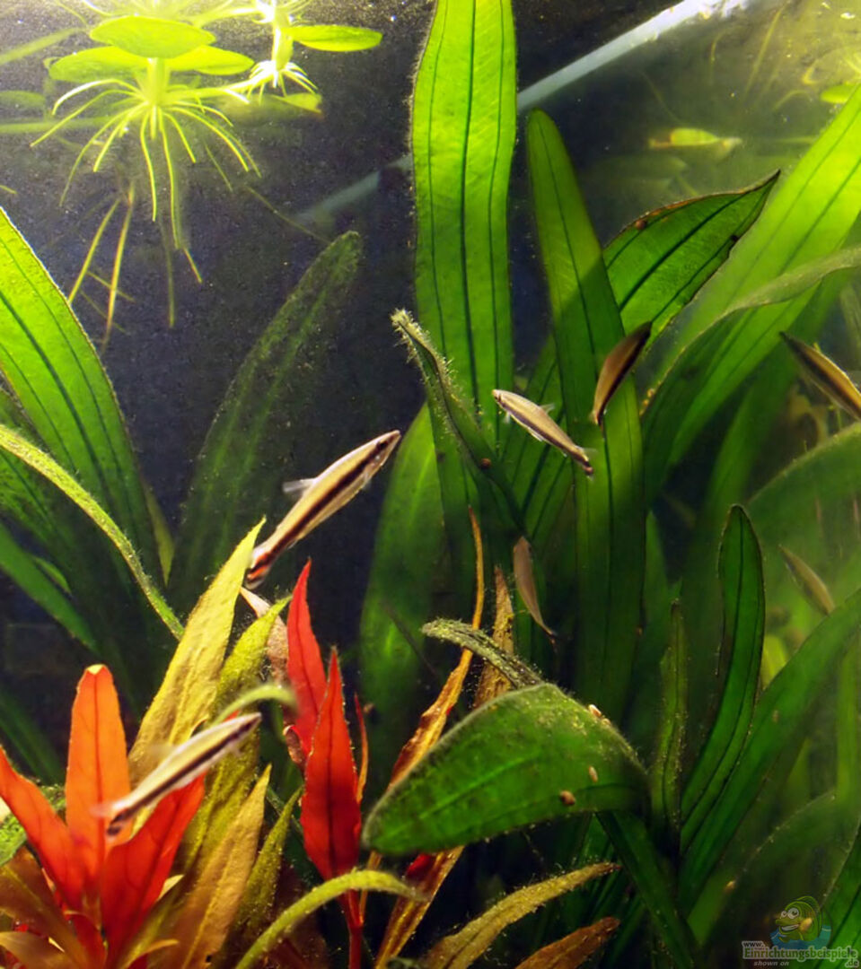 z.Z.: 1 Apfelschnecke, TDS und Helenas; 10 Bänderpanzerwelse (Corydoras schwarzii), 10 Einbinden-Ziersalmler (Nannostomus unifasciatus), 3 Rot-Blaue Kolumbianer (Hyphessobrycon columbianus) + 4 Jungfische, 16 Rote Neon (Paracheirodon axelrodi), 17 Zitronensalmler (Hyphessobrycon pulchripinnis) 6 davon sind 2.Generation + 2 Jungfische, 2 Scalare (Pterophyllum scalare)