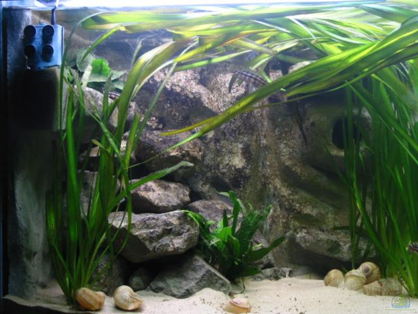 Selbstgebaute Rückwand aus Styropor und dann mit Portlandzement ´übermalt´. Anschliessen mit Graniteffektspry die dunkle Farbe gegeben und mit Epoxidharz versiegelt. In der rechten unteren Ecke befindet sich hinter der Aussparung der Ansaugkorb und oben die Druckseite des Eheim Aussenfilters.