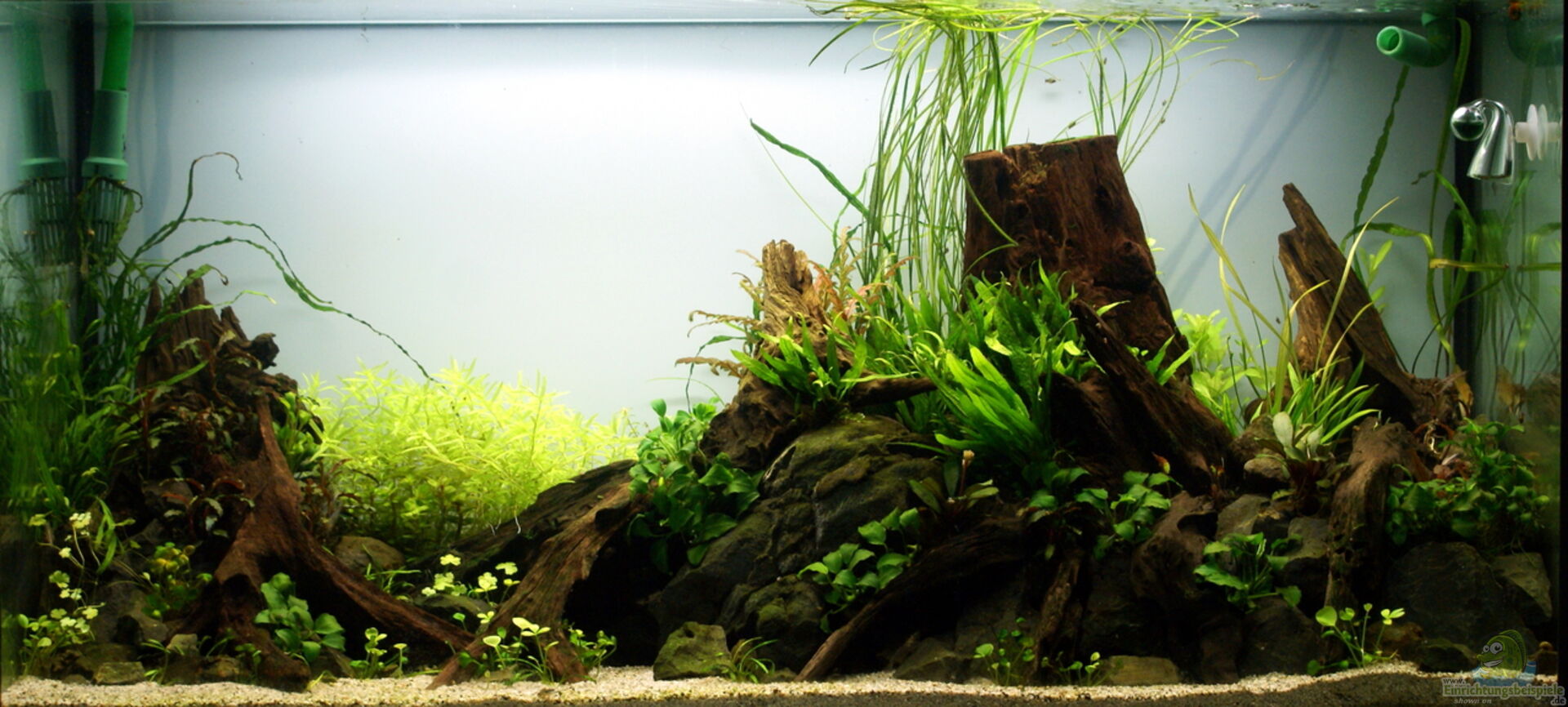 Das Aquarium ist vor allem ein Pflanzenbecken ohne gro??e Besonderheiten. Das Becken selbst ist ein über 15 Jahre altes Juwel-Standardbecken mit Längsstreben. An der Rückwand wurde eine selbstklebende Milchglasfolie aus dem Baumarkt angebracht.