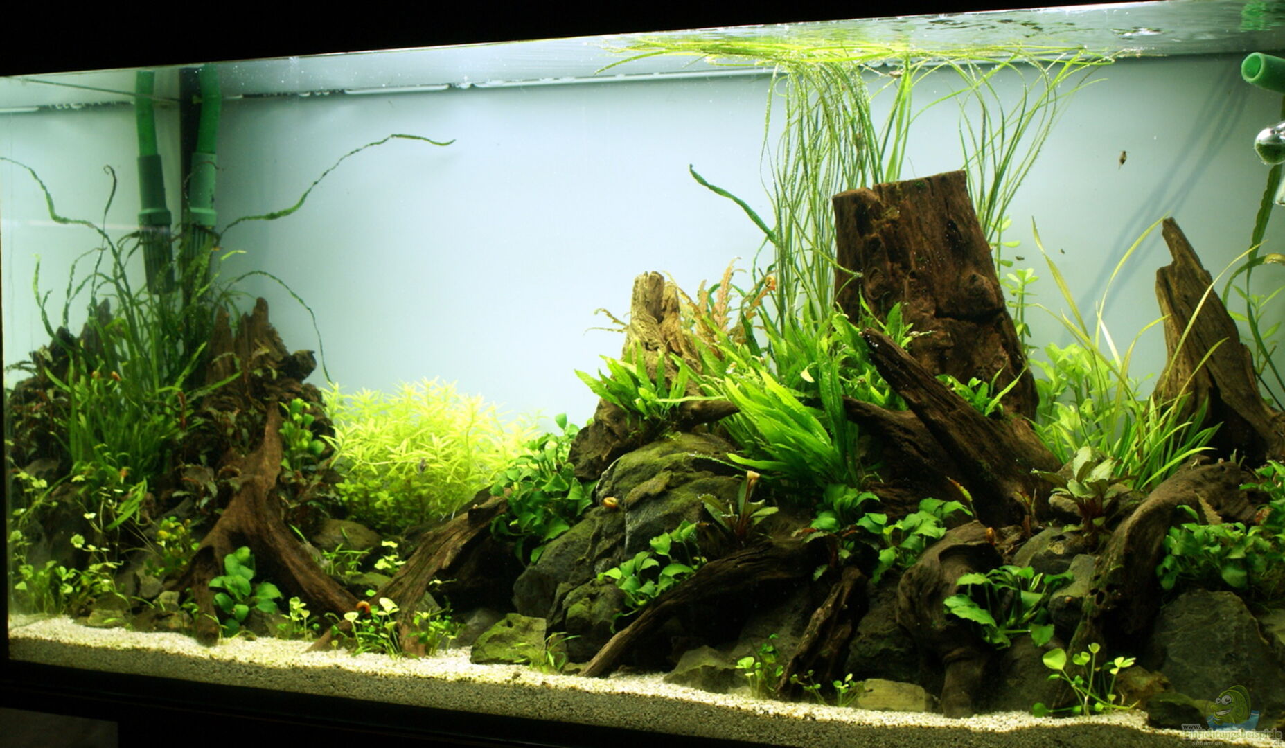 Das Aquarium ist vor allem ein Pflanzenbecken ohne gro??e Besonderheiten. Das Becken selbst ist ein über 15 Jahre altes Juwel-Standardbecken mit Längsstreben. An der Rückwand wurde eine selbstklebende Milchglasfolie aus dem Baumarkt angebracht.