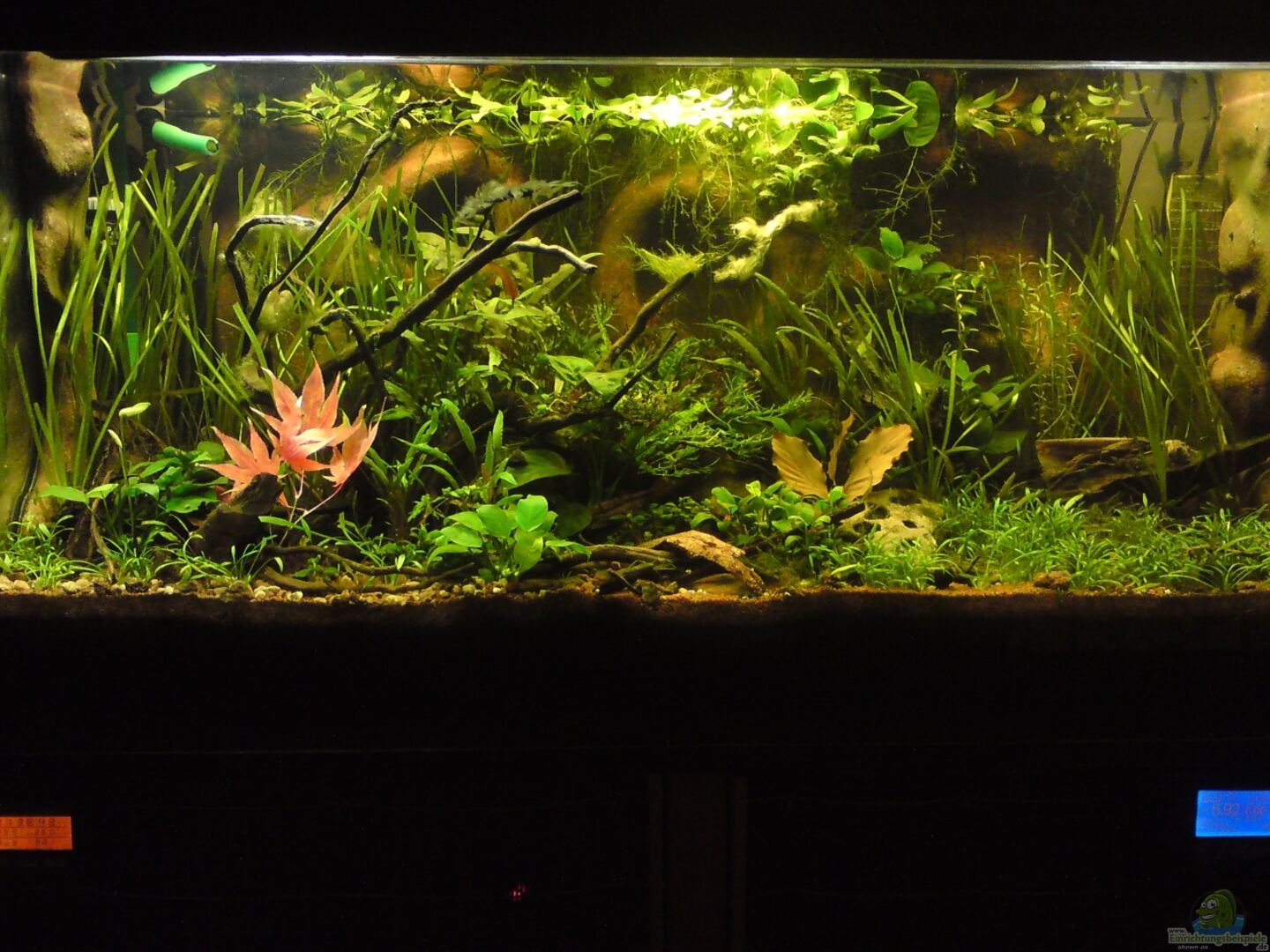 Eigenbaurückwand aus Styropor, Portlandzement und Epoxidharz. Moorkienwurzel und Pflanzentaschen eingearbeitet, eingefärbt und mit Flu??sand abgestreut. Fassungsvermögen: ca. 150 Liter netto. Eigenbau Unterschrank "Buche" von unseren Schreinerlehrlingen.