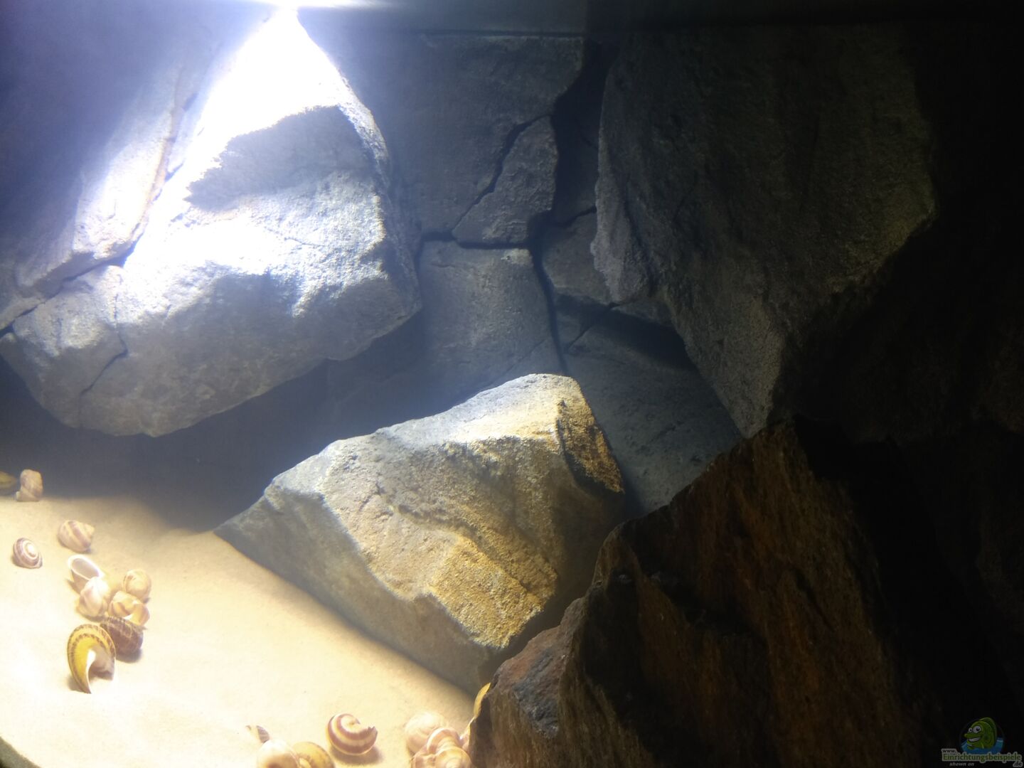 Aquariumrückwand von Aquadecor - Model A 26 Auf beiden Seiten Aussparungen für die Filtereinläufe und einen Heizstab. Auf beide Seiten ein feines Gitter um ein Hinterschwimmen zu verhindern. Diverse Steine aus umliegenden Flüssen.