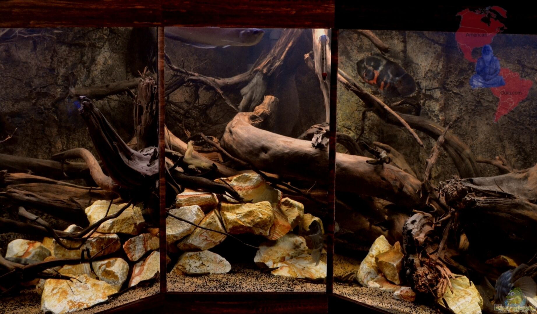 Wir befinden uns im Jahre 2012, inmitten des südamerikanischen Schwarzwasserflusses "Rio Negro" auf einem fiktiven Riff (aus Steinen), an dem sich durch die Strömung im Laufe der Zeit eine grosse Menge an Totholz aufgetürmt hat. Darin leben die Bewohner dieses, meines Aquariums. Soviel zur Idee die hinter dieser Einrichtung steckt ;-)). Ziel der Umgestaltung war die Schaffung eines noch besser strukturierten Grosscichliden-Aquarium mit vielen Verstecken und Revieren für die Buntbarsche. [...]