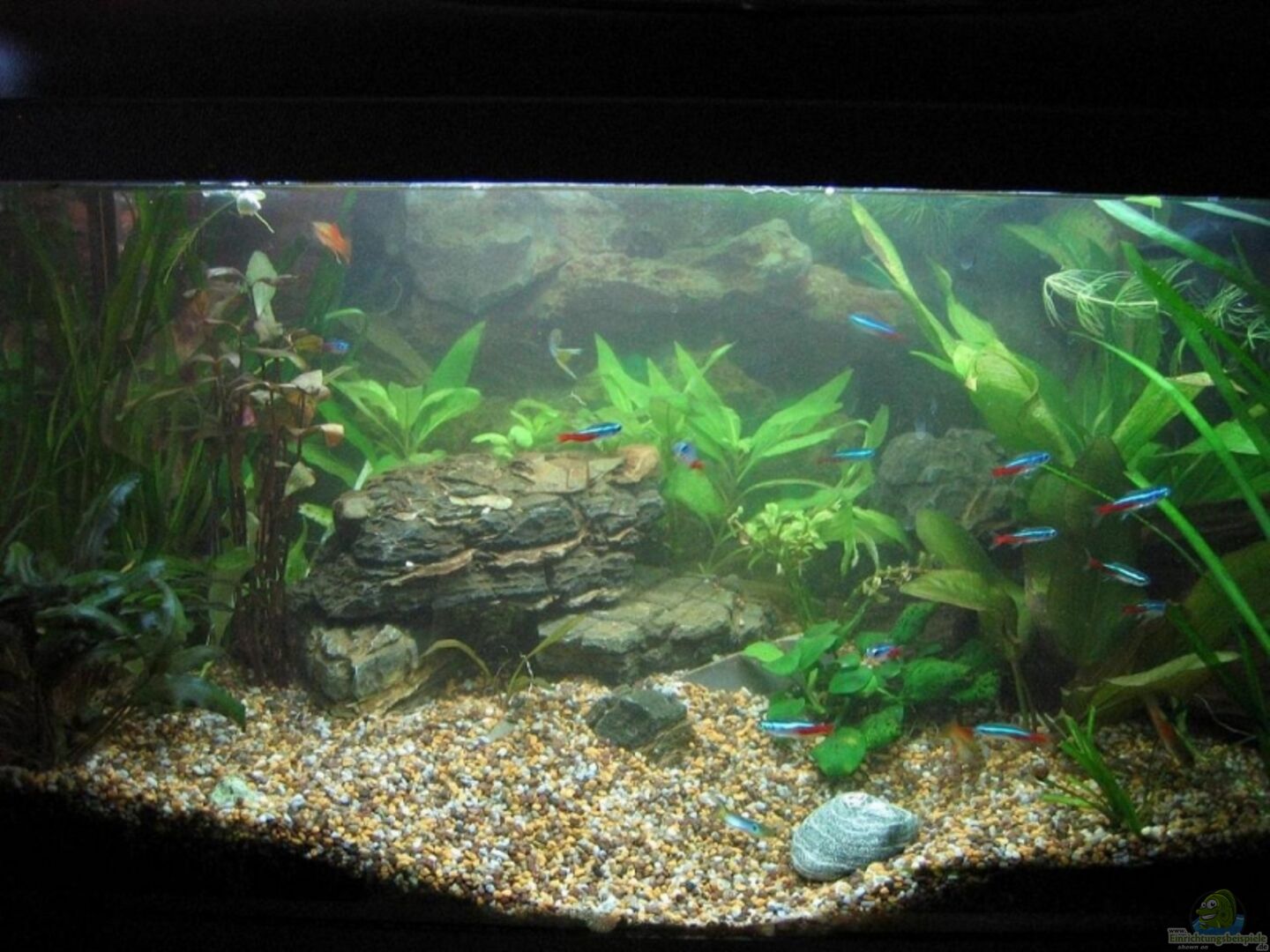 Komplettset von AquaEl, gekauft im April 2007 Bei Dehner für 29.99 Euro. Dabei war 54 L.Becken, eine Pumpe, ein Regelheizer, ein Thermometer und die Abdeckung mit einer Leuchte. Aquariumunterseite mit Schutz aus Hartplastik und einer Kiesblende Als Hintergrund eine Fototappete an die Wand dahinter (Tiefenwirkung, da der Schrank auf dem das Aquarium sicher steht nicht ganz bis zur Wand reicht.)