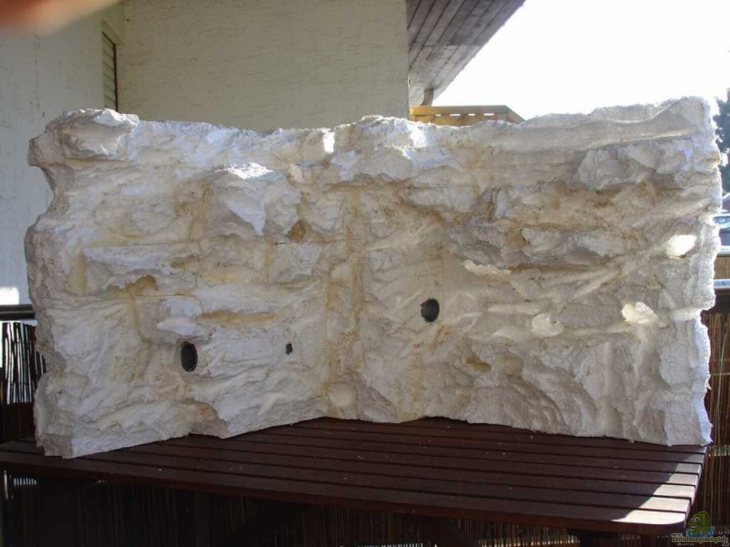 * Rückwand aus Styropor/Zement/Kunstharz mit mehreren Ebenen, Höhlen und Zu- und Ablauf * 2 mittlere Lochsteine als Versteck für Jungtiere * Bruchsteine aus der Umgebung * zwei Wurzeln für Welse