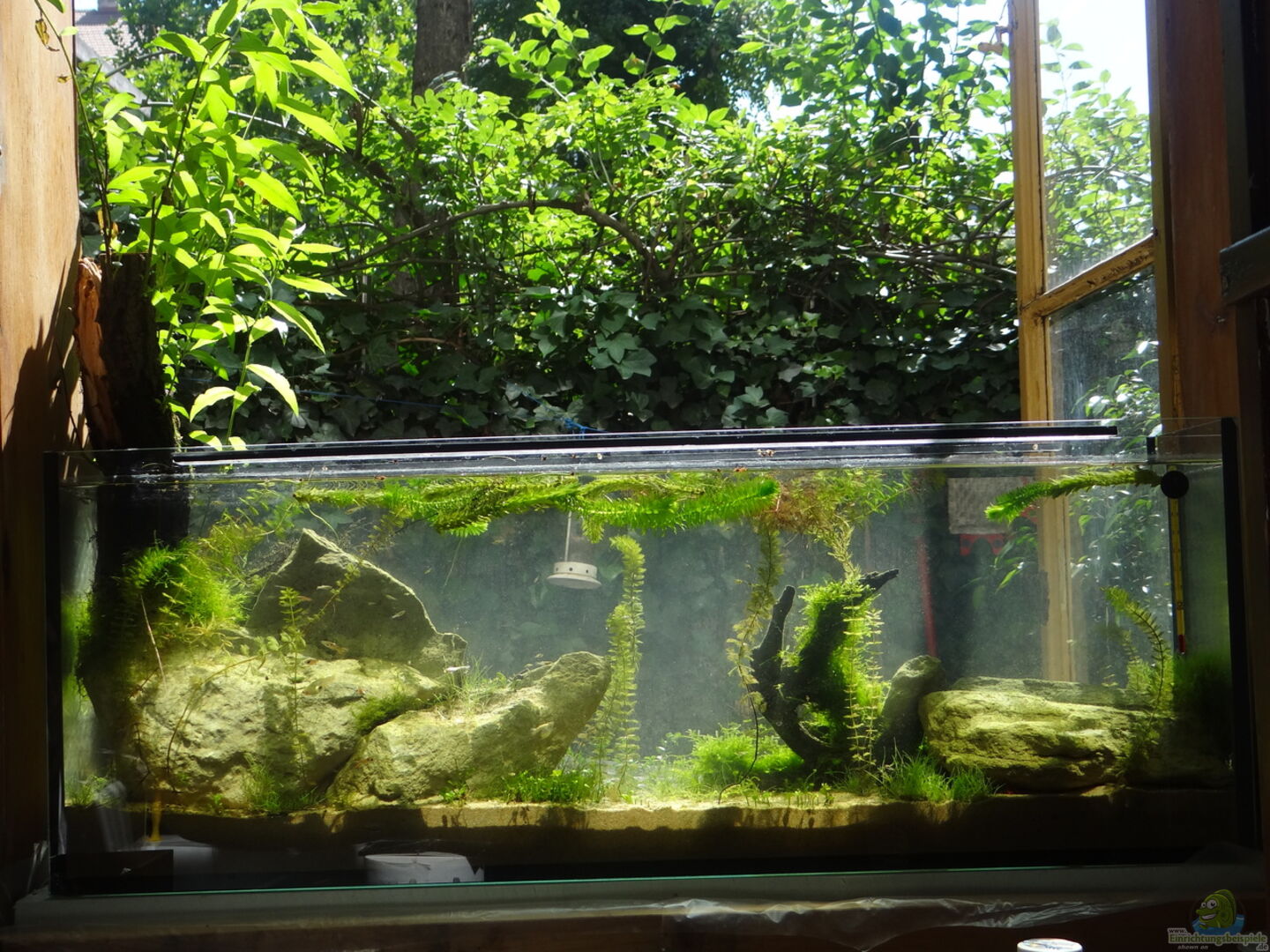 Das Becken ist ma??gefertigt, damit es genau ins Kastenfenster hineinpasst. Da die Fenster schon älter sind, wird das Aquarium sowohl jahreszeitlichen wie auch täglichen Temperaturschwankungen unterliegen.