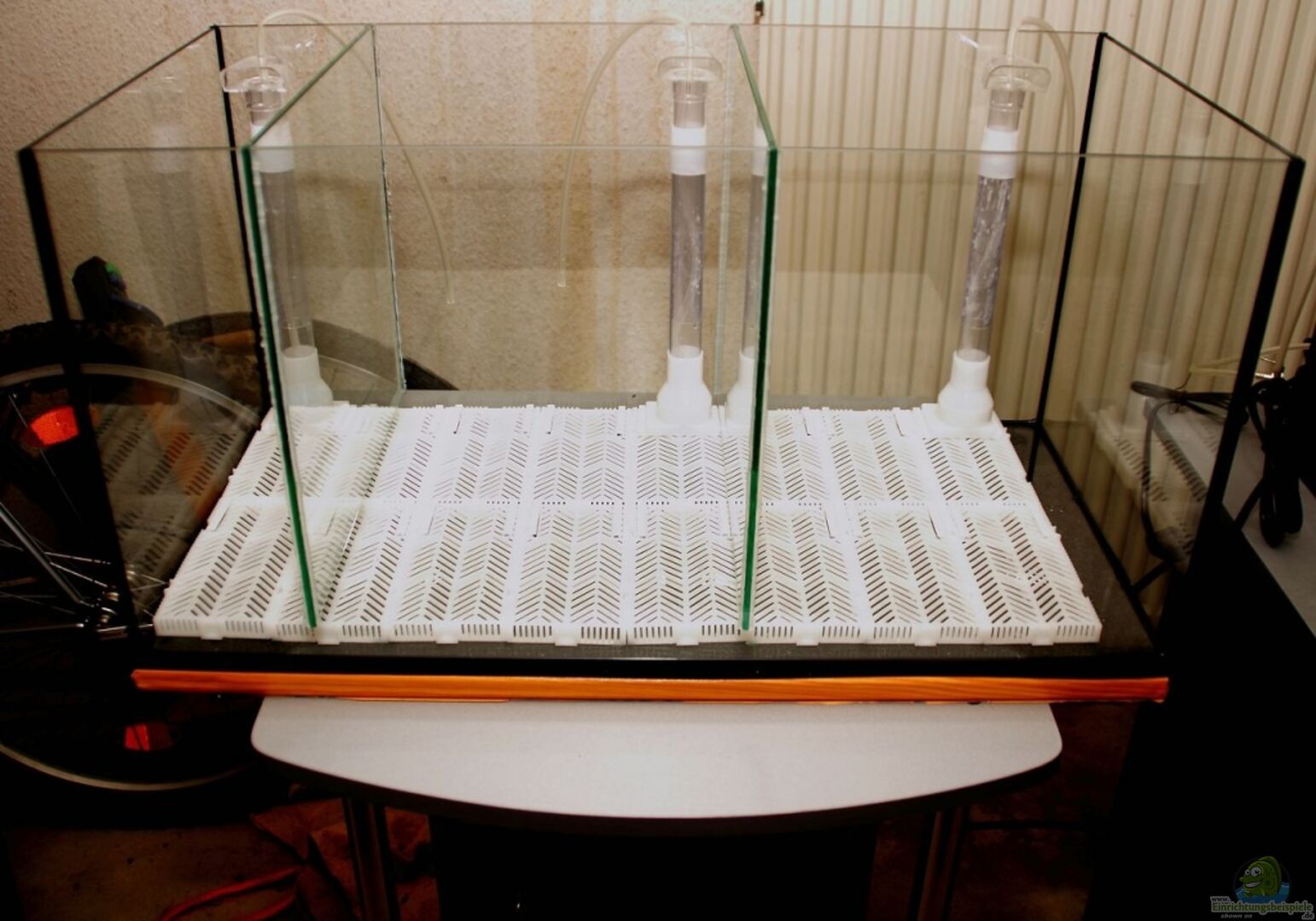 - Artenbecken - Züchterbecken Das Becken selbst ist ein handelsübliches 54er Becken von Tetra (kein AquaArt!), in welches ich zwei Glasscheiben zur Trennung eingeklebt habe. Die Trennung verläuft jedoch nur oberhalb des Bodenfilters, sodass das ganze Becken ein verbundenes Bodenfiltersystem hat. Somit habe ich über den Bodengrund ein Filtersystem mit 8 Litern Volumen auf (Rest/netto) 46 Liter Wasser. Auch habe ich die durch die Scheiben getrennten Beckenteile mit U-förmigen Schlauchsystemen [...]