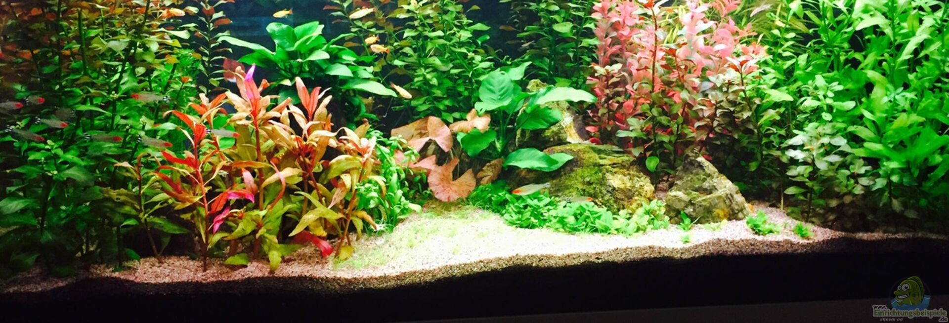 Das Becken fungiert als Raumteiler und ist von 3 Seiten aus Einsehbar. Dennoch liegt der Fokus auf der Frontseite, auf der Rückseite befindet sich eine Eckcouch, sodass die dichte Bepflanzung an der Stelle, wo man meist sitzt, bis direkt an die Scheibe geht. Rechts zur Raummitte hin ist auch auf der Rückseite eine kleine freie Fläche, wo sich vor allem der Schwarm Rotkopfsalmler gerne aufhält. So hat man von beiden Seiten aus einen Blick auf die Fische.